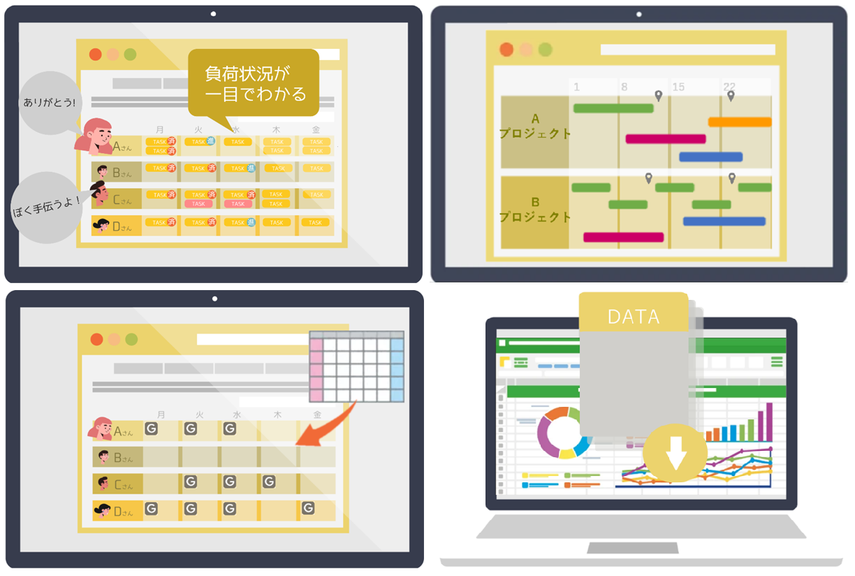 何の業務で課題があるのか、誰が課題を抱えているのかを見て助け合うことができます。