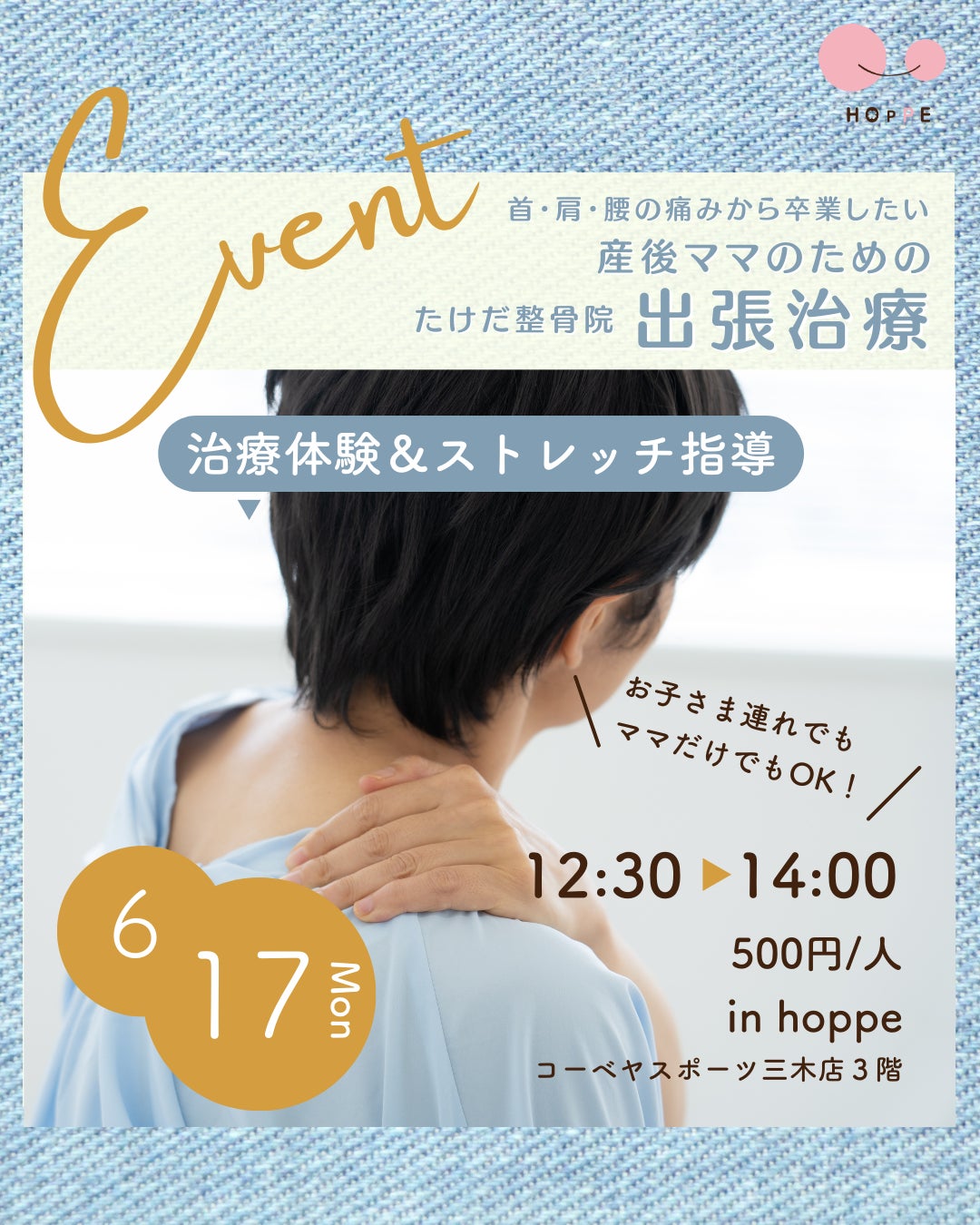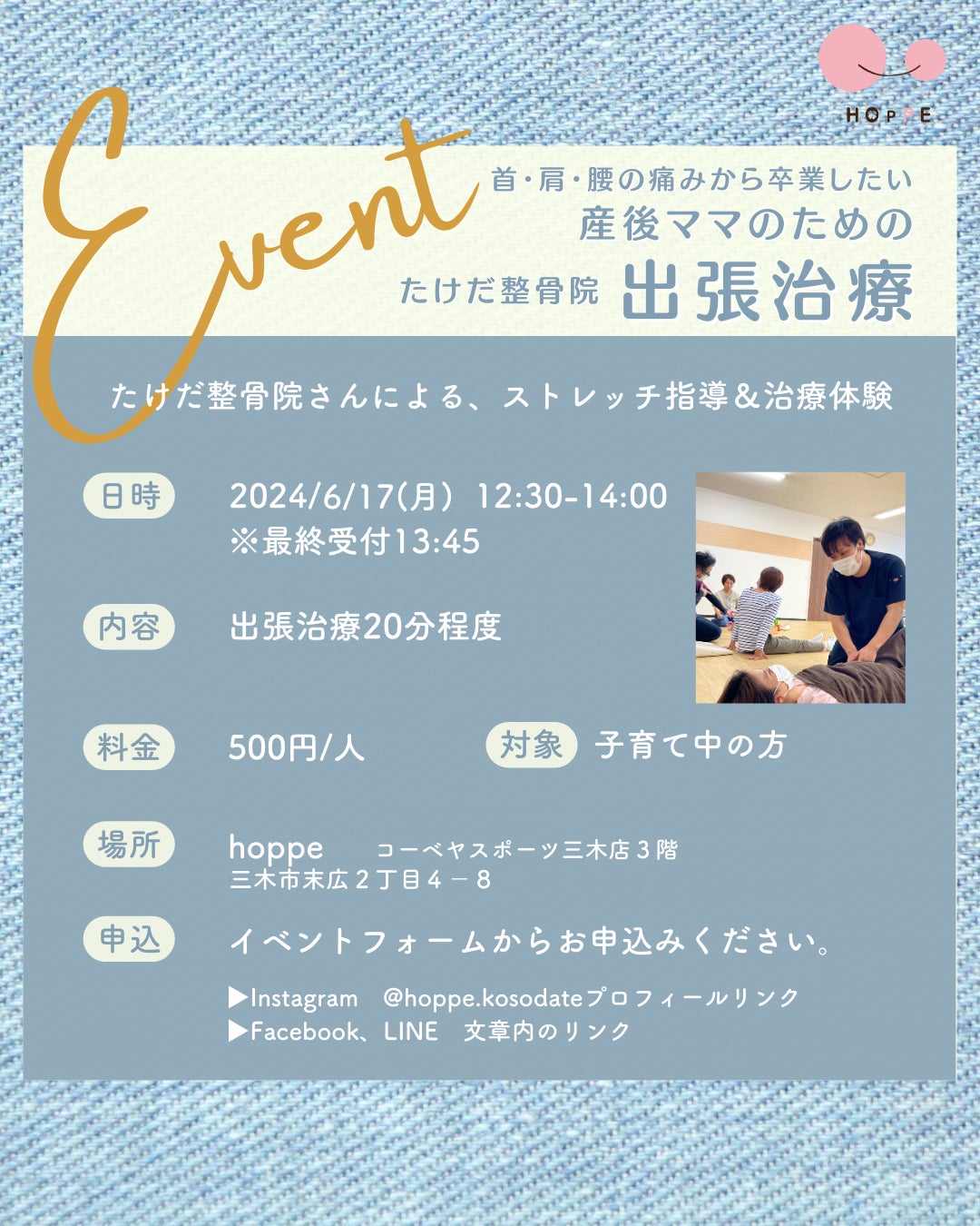 特定非営利活動法人ほっぺ(代表:大森 奈津子)は、たけだ整骨院さんをお招きし、2024年6月17日(月)hoppe(コーベヤスポーツ三木店3階)にて、『産後ママのための出張治療』を開催いたします。