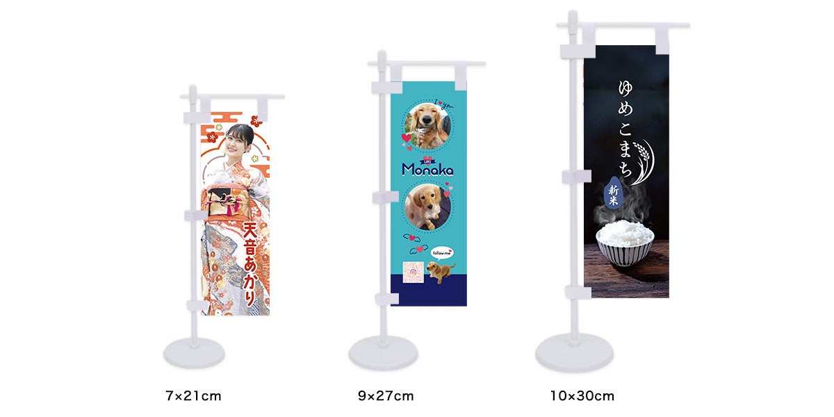 店舗のレジ横などの狭いスペースでも高い宣伝効果を発揮する「ミニのぼり」は、専用のスタンドパーツ付きで届いたその日から設置可能です。
