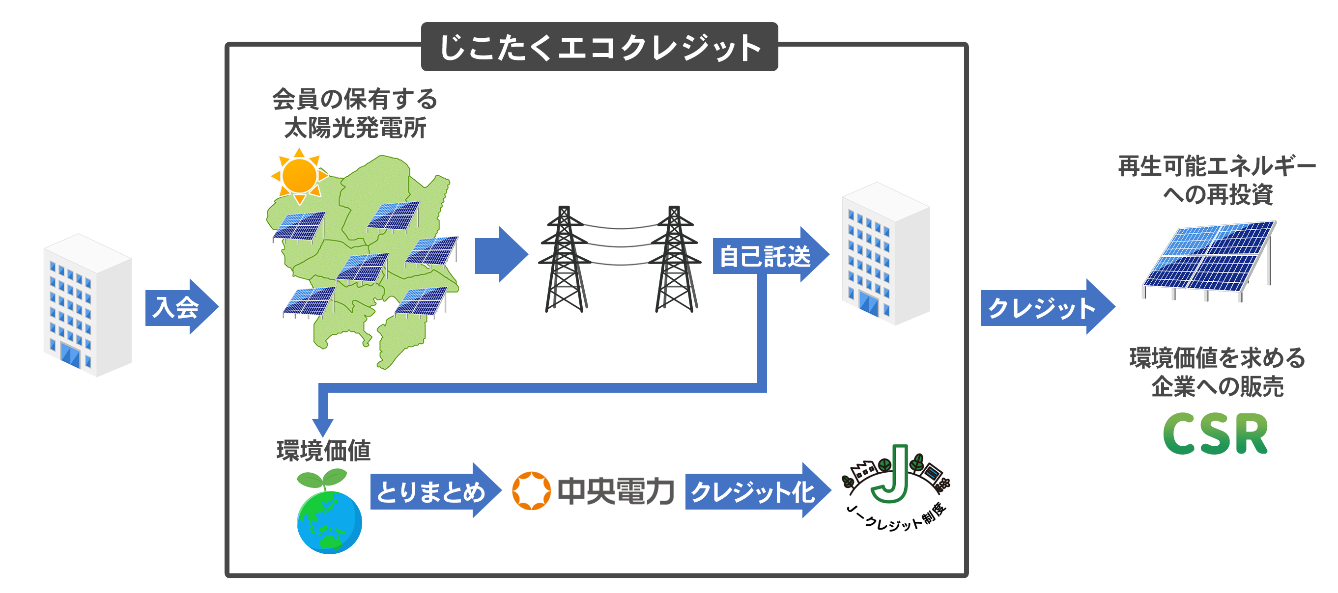 そこで中央電力は、NonFIT太陽光発電所で発電する電力を用いて自己託送を行う事業者向けに、「じこたくエコクレジット」サービスの提供を開始することにしました。