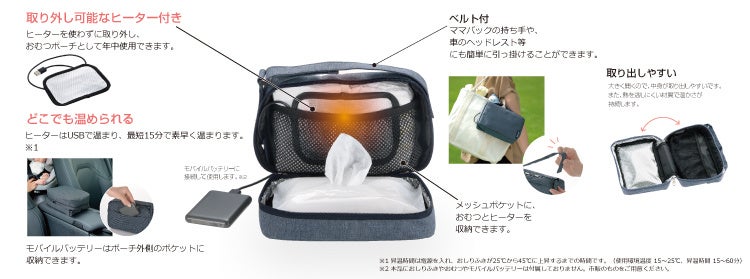 おうち用の「おしりふきウォーマーR」はヒーター部とおしりふきをいれるフタが分離するので簡単に持ち運べ、コンセントを抜く手間がなく、部屋を選ばず、すぐにおむつ替えができます。おでかけ用の「おでかけおしりふきウォーマーR」はUSBタイプなので、モバイルバッテリー等に接続して使用でき、外でもおうちと同じ温かさでおむつ交換が出来ます。どちらも、赤ちゃんを待たせないように素早く温めることができるように工夫しました。