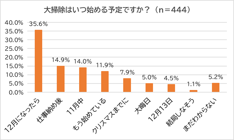 「大掃除をする予定がある」と回答した444人に「いつ始める予定か?」聞きました。最多は「12月になったら」(35.6%)、以下「仕事納めの後」(14.9%)、「11月中」(14.0%)、「もう始めている」(11.9%)となり、「結局しなそう」(1.1%)も僅かにいました。