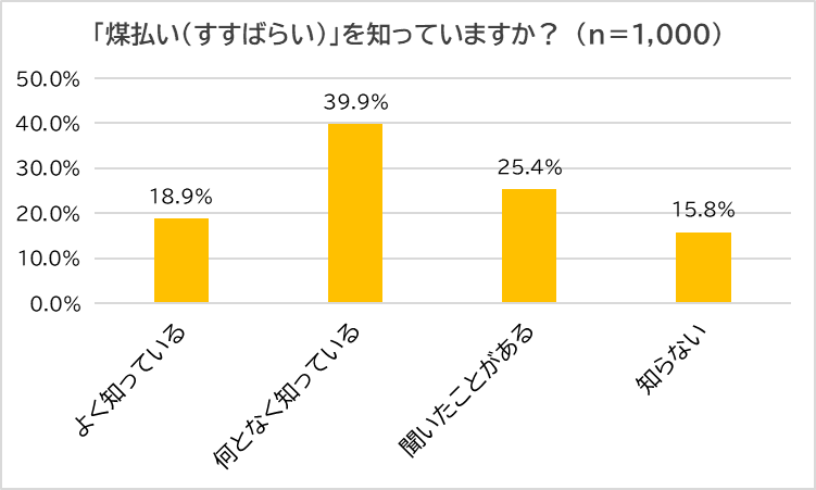 今度は、「『煤払い(すすばらい)』を知っているか?」聞きました。最多は「何となく知っている」(39.9%)となり、2割弱(18.9%)が「よく知っている」と回答したものの、「知らない」も同じ程度(15.8%)いました。