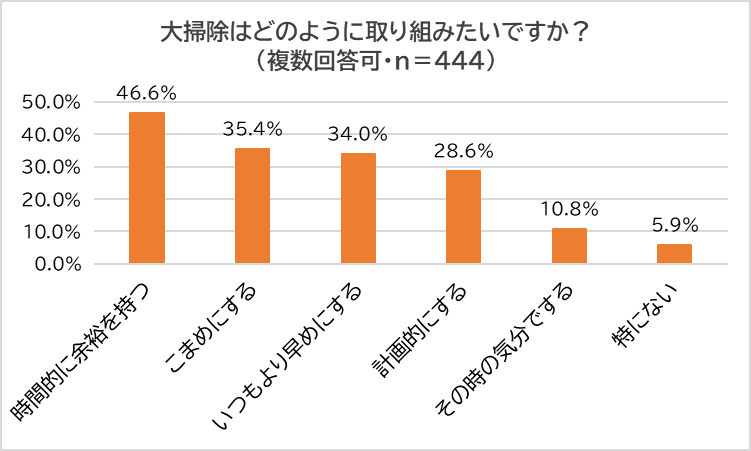 続いて、「大掃除はどのように取り組みたいか?」聞きました。半数近く(46.6%)が「時間的に余裕を持つ」と回答し最多、「こまめにする(35.4%)、「いつもよりも早めにする」(34.0%)、「計画的にする」(28.6%)と続きました。