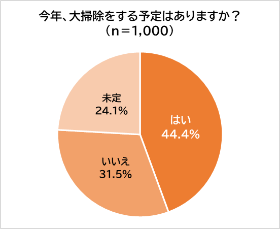 「今年、大掃除をする予定はあるか?」と聞いたところ、「はい」(44.4%)、「いいえ」(31.5%)、「未定」(24.1%)となりました。