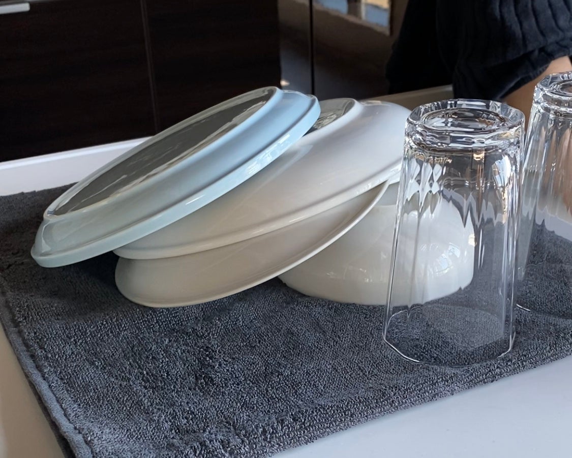 吸水タオルに直接食器を重ねると、バランスを考えたり、お皿の収納量が少なくなるなどがありますが、「すっきり暮らす水切りかご」を吸水タオルの上に置いて使うことで、お皿を重ねやすくなり、収納量がアップします。洗った食器をスムーズに置いていけるので、実際にスタッフが同じ量の洗い物を、吸水タオルに直接置いた場合と比較してみたところ、洗い物は半分の時間で終わりました。洗い物の時間が短くなるだけでなく、その間に流している水道の水も節約できます。