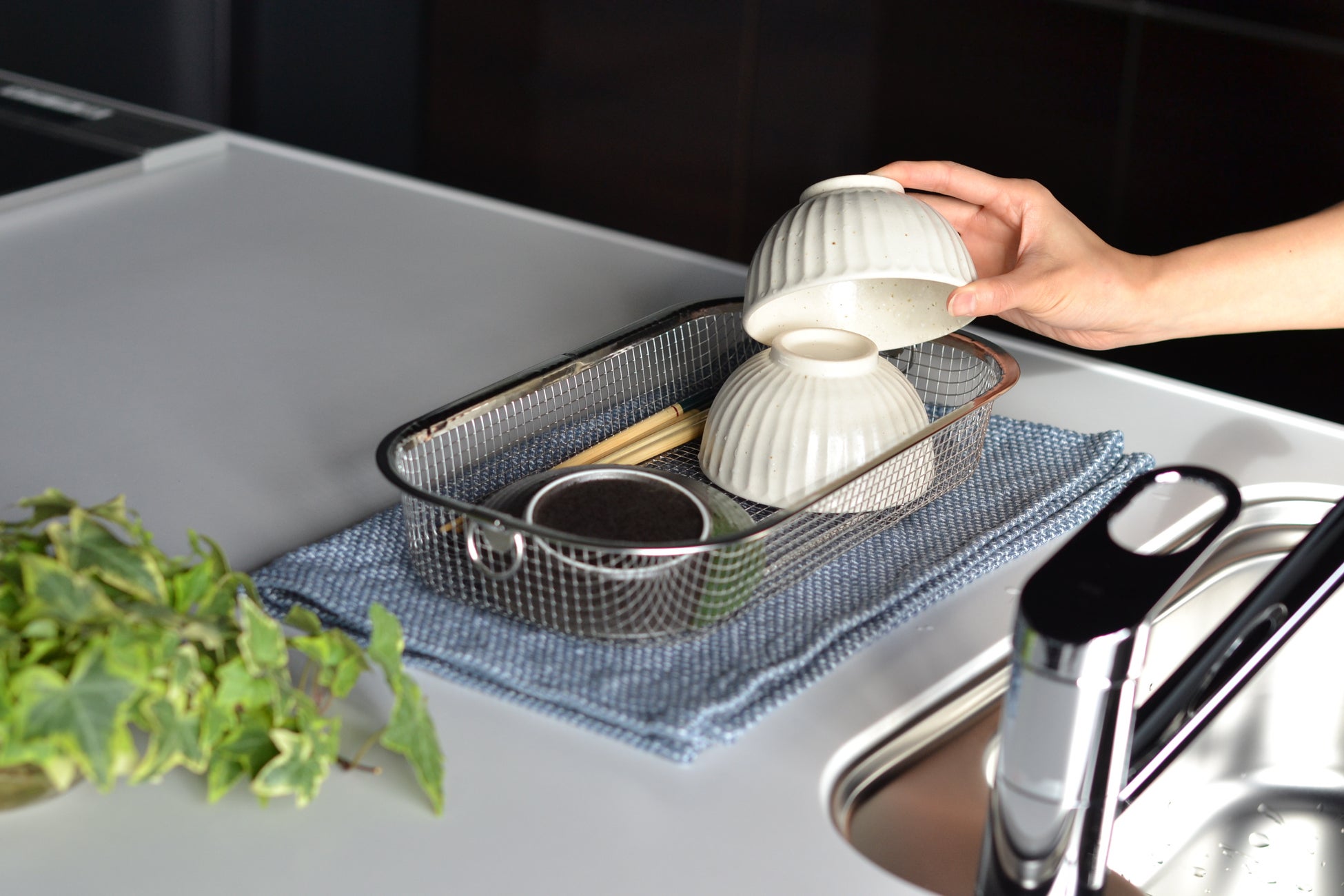 そこで、水切りかごを置かず吸水タオルを使っている人に向けた新発想の水切りかご「すっきり暮らす水切りかご」をご提案致します。