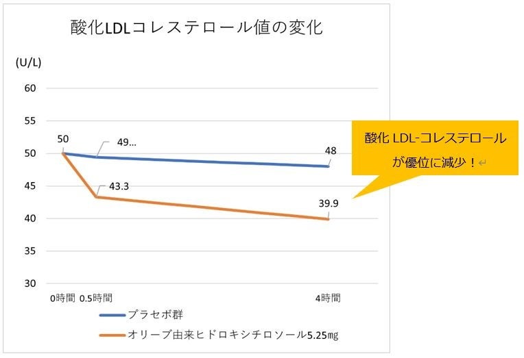 プラセボ群と比較して、血中酸化LDL-コレステロールの4時間値ではプラセボ群48.0U/Lに対し、ヒドロキシチロソール群では39.9U/Lと、プラセボ群と比較して有意な結果が得られました。
