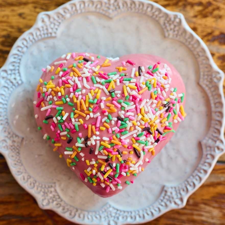 イチゴチョコレートで華やかに仕上げたハート型ドーナツ。見た目も可愛らしく、5色のスプレーチョコがアクセント。中にはたっぷりの生クリームが入っています。