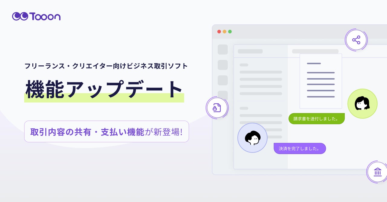 Tooon株式会社(本社:熊本県熊本市、代表取締役:杉山裕磨)は、フリーランス・クリエイター向けビジネス取引ソフトのTooon(トゥーン)において、新たに「取引共有機能」「支払い機能」をリリースしたことを発表いたします。