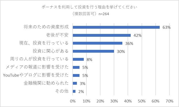 また、「ボーナスを利用して投資を行う理由を挙げてください」との質問では1位が「将来のための資産形成」(63パーセント)、2位が「老後が不安」(42パーセント)となりました。その他では「現在、投資を行っている」(36パーセント)、「投資に関心がある」(30パーセント)が多くの回答を集めました。上位2つの回答を見ると「将来への備え」が投資の大きな動機付けになっているようです。