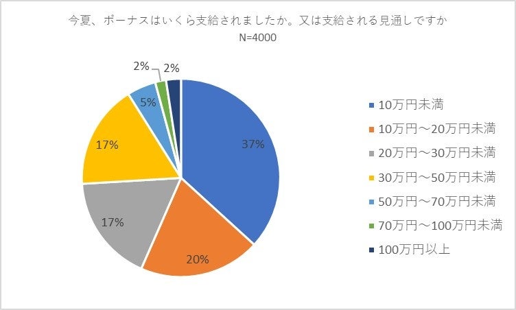 最初に回答者全員に対して「今夏、ボーナスはいくら支給されましたか。又は支給される見通しですか」との質問を行いました。その結果、「10万円未満」が37パーセントで最多の回答を集めました。続いて「10万円~20万円未満」が20パーセントで入り、6割弱が20万円未満の支給であることがわかりました。さらに「20万円~30万円未満」と「30万円~50万円未満」がともに17パーセントで後に続きました。