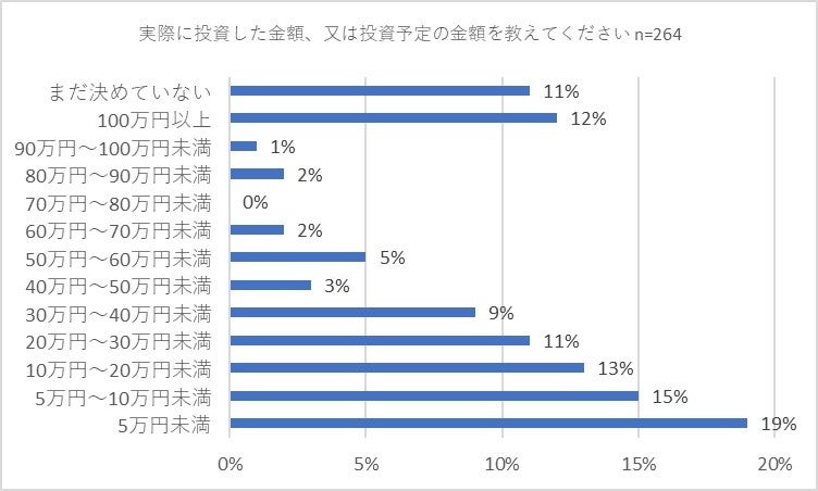 最後に、実際に投資した金額、又は投資予定の金額を質問しました。「5万円未満」が19パーセントで最多。「5万円~10万円未満」が15パーセントで2位となりました。それ以降では「10万円~20万円未満」(13パーセント)、「100万円以上」(12パーセント)、「20万円~30万円未満」と「まだ決めていない」(ともに11パーセント)が続きました。10万円ごとの数字で見てみると「10万円未満」が34パーセントで突出した数字となりました。