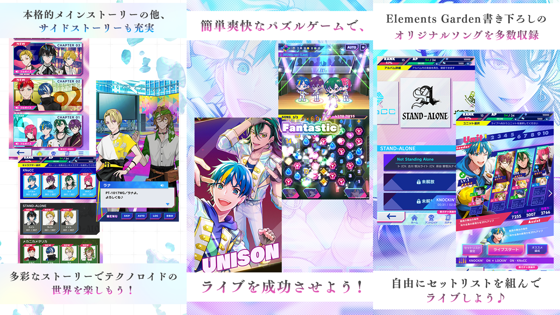 アンドロイドたちを育成し、オリジナルユニットでライブステージにチャレンジ。