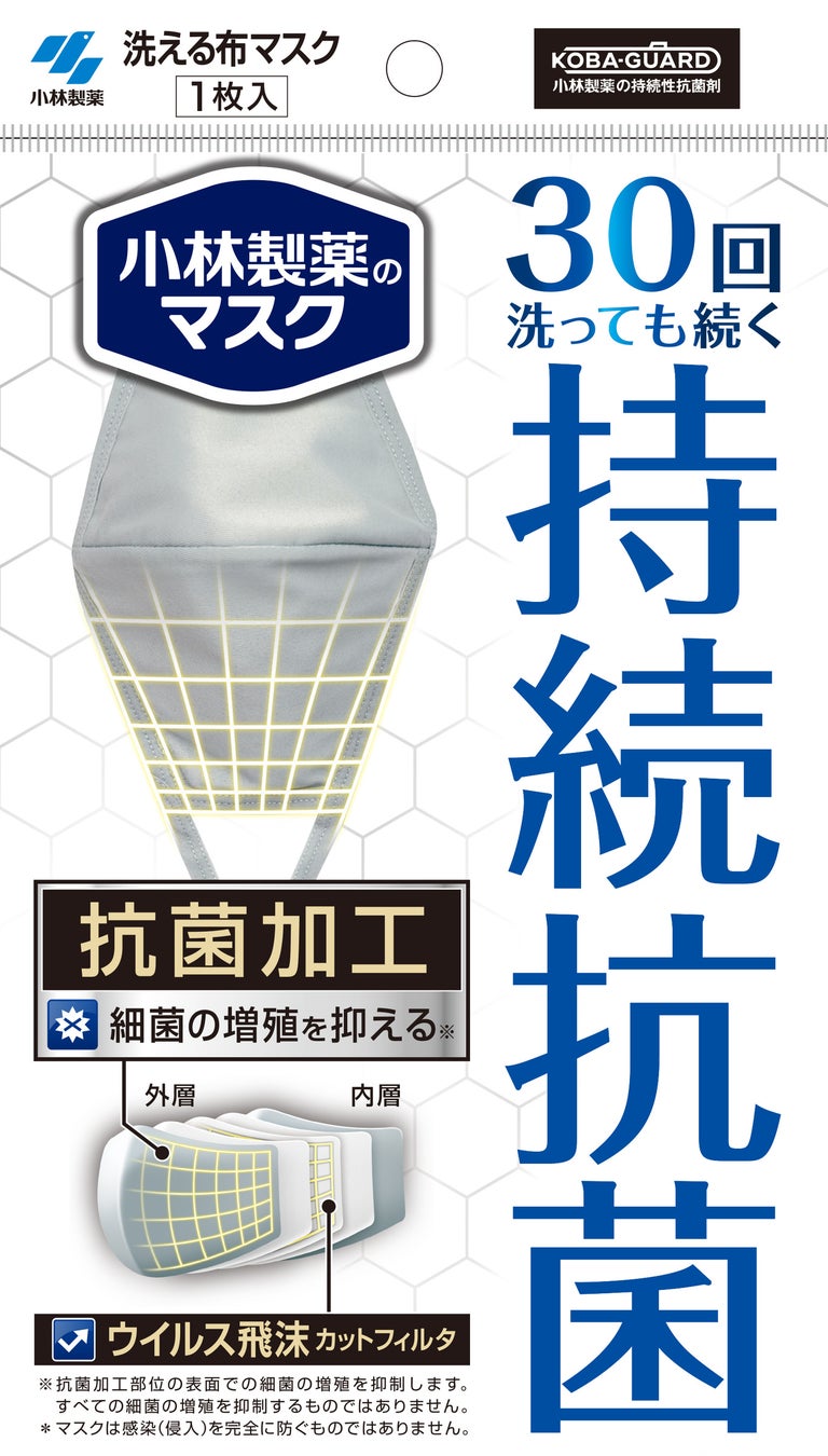 そこで、当社が保有す『KOBA-GUARD』技術を用いて、肌触りの良い繰り返し洗える布マスクでありながらも、持続的に細菌の増殖を抑え※、1ウイルス飛沫カット※2ができる製品を開発いたしました。小林製薬では自社独自の技術を活用し、今後も生活者の皆様のニーズにアプローチする製品を開発してまいります。
