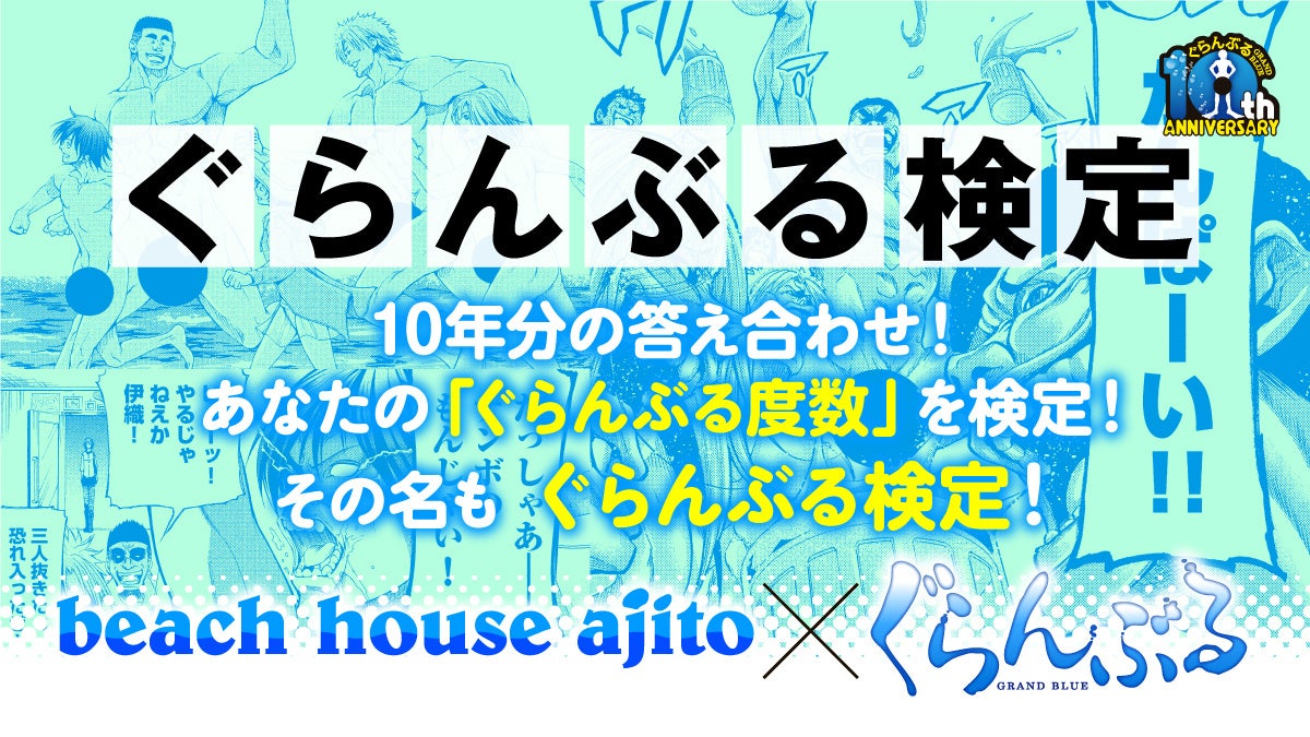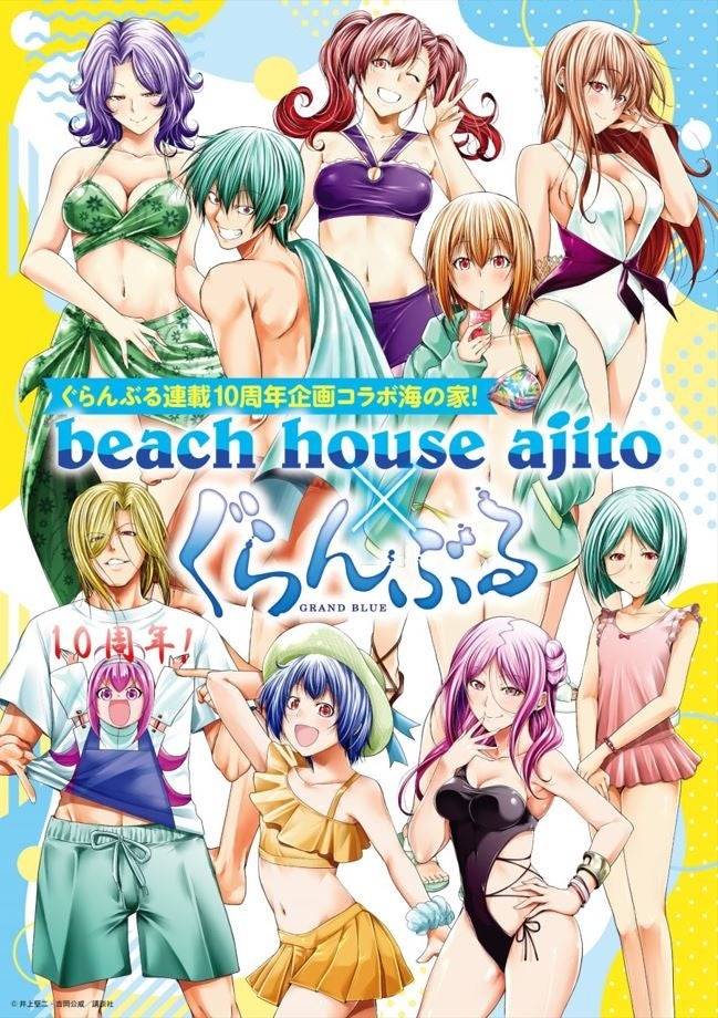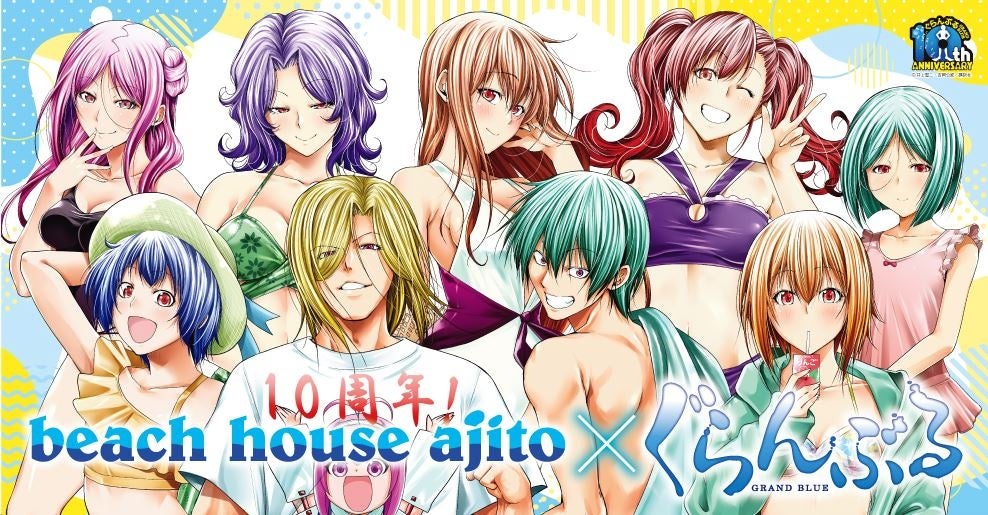 会場は片瀬西浜海岸、新江ノ島水族館の目の前に位置する「beach house ajito」。300平方メートルを超える広さを持つ海の家に、ぐらんぶるの世界観がたっぷり味わえる仕掛けがめじろ押し。2024年4月に連載開始10周年を迎えた本作品を華やかに彩る。