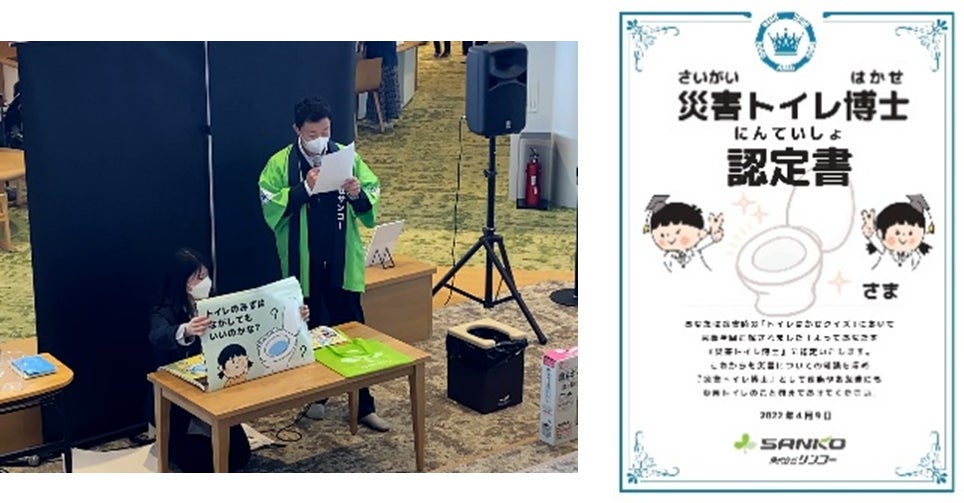 生活サポート用品を開発、製造、販売する株式会社サンコー(本社:和歌山県海南市/代表取締役:角谷太基)は、2022年4月9日(土)「『しえきのいま』~はたらくクルマ 2022 春~」イベント内にて、お子さま向けの「災害時のトイレクイズ!」を実施しました。防災士の資格を持つ株式会社サンコーの社員より、子どもたち向けに、いざというときの備えや、携帯用トイレの使い方について、紙芝形式でクイズを出題しながらレクチャーしました。サンコー公式YouTubeチャンネル:https://youtu.be/Hde98ajt6D8