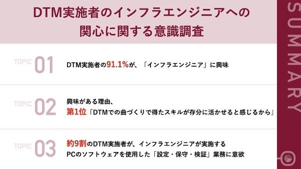 【DTM実施者100名へ調査】DTMを行う9割以上が、「インフラエンジニア」に興味!6割強が「DTMでの曲づくりで得たスキルが存分に活かせる」と実感