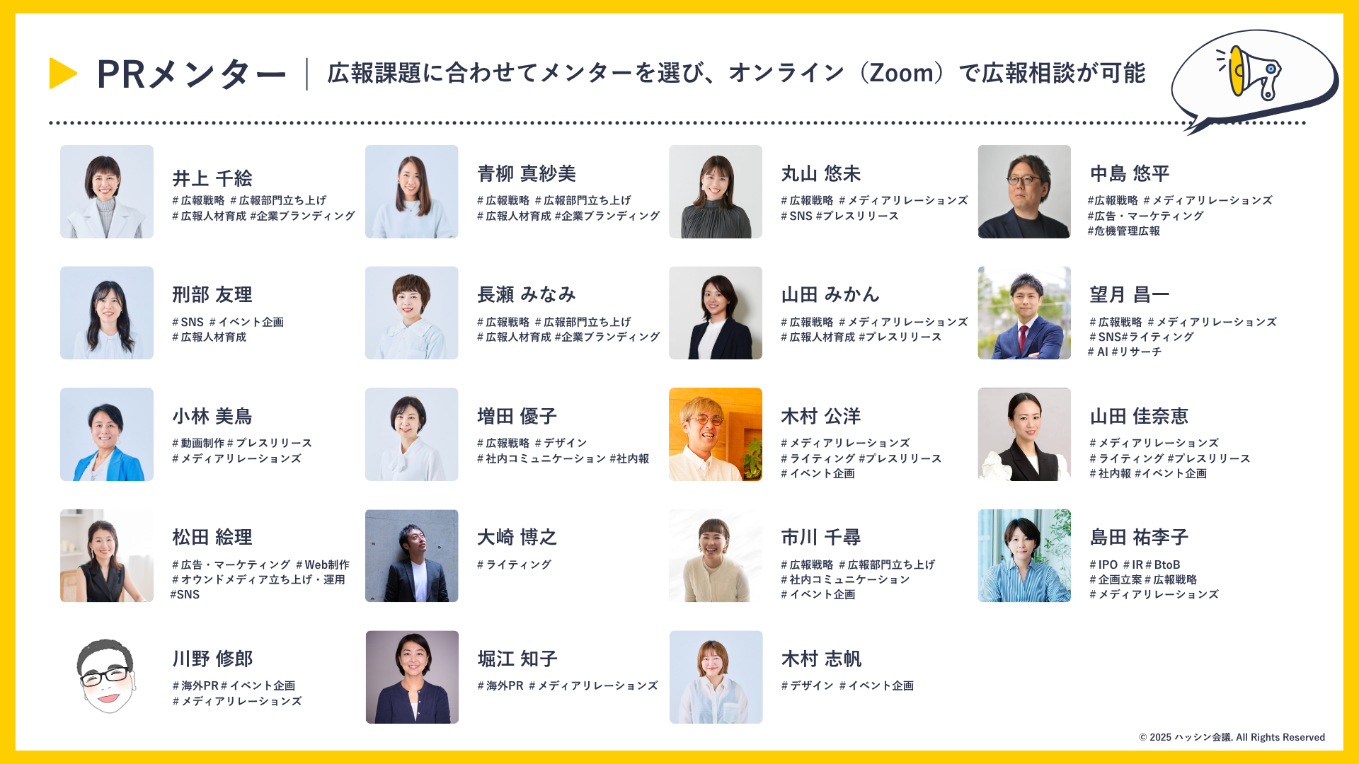 当社が主宰するPRコミュニティでは【学び・相談・交流の場】をワンストップで提供しています。現在19名在籍するPRメンターに対し、広報戦略やプレスリリースの作成、SNS運用はもちろん、AI活用、海外PR、動画制作、ライティングなどの幅広い悩みを相談することが可能です。
