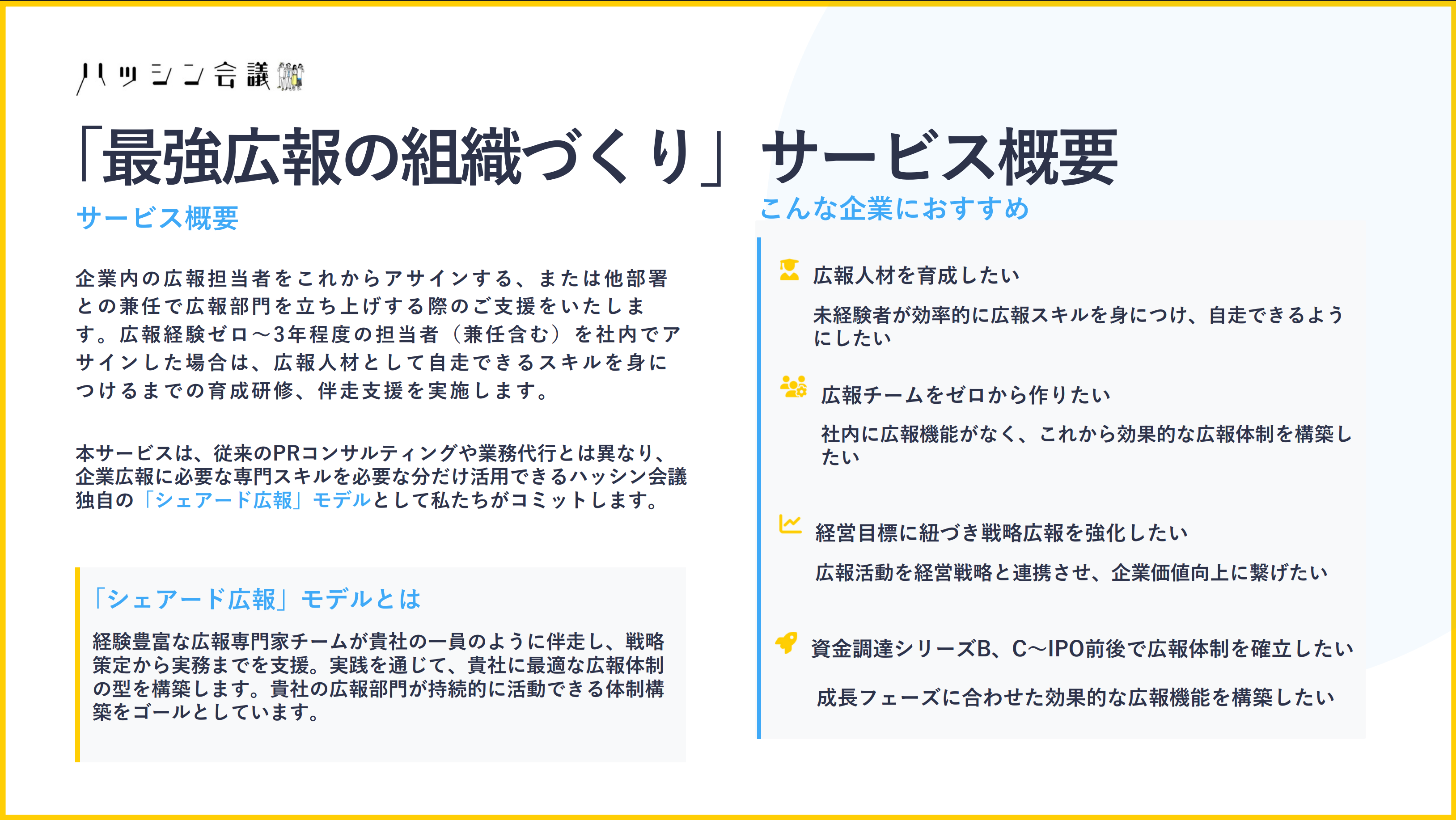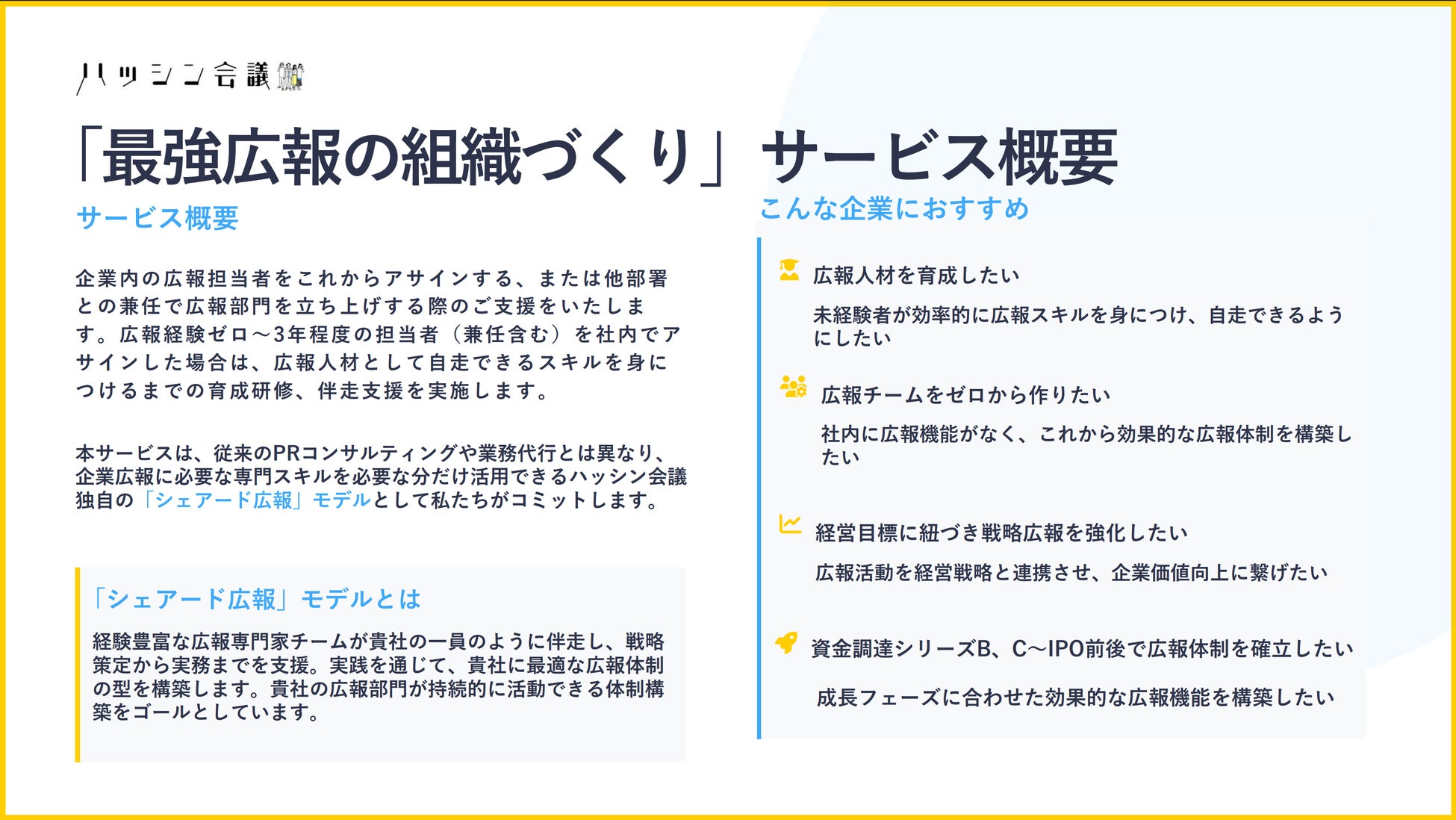 企業の広報組織づくりと広報人材の育成を支援する株式会社ハッシン会議(本社:東京都港区、代表取締役 井上千絵、以下当社)の夢は、「広報を経営に不可欠な存在にする」ことです。私たちは、広報を単なる発信業務ではなく、事業成長、採用、信頼形成、組織づくりを支える経営機能として社会に広げたいと考えています。