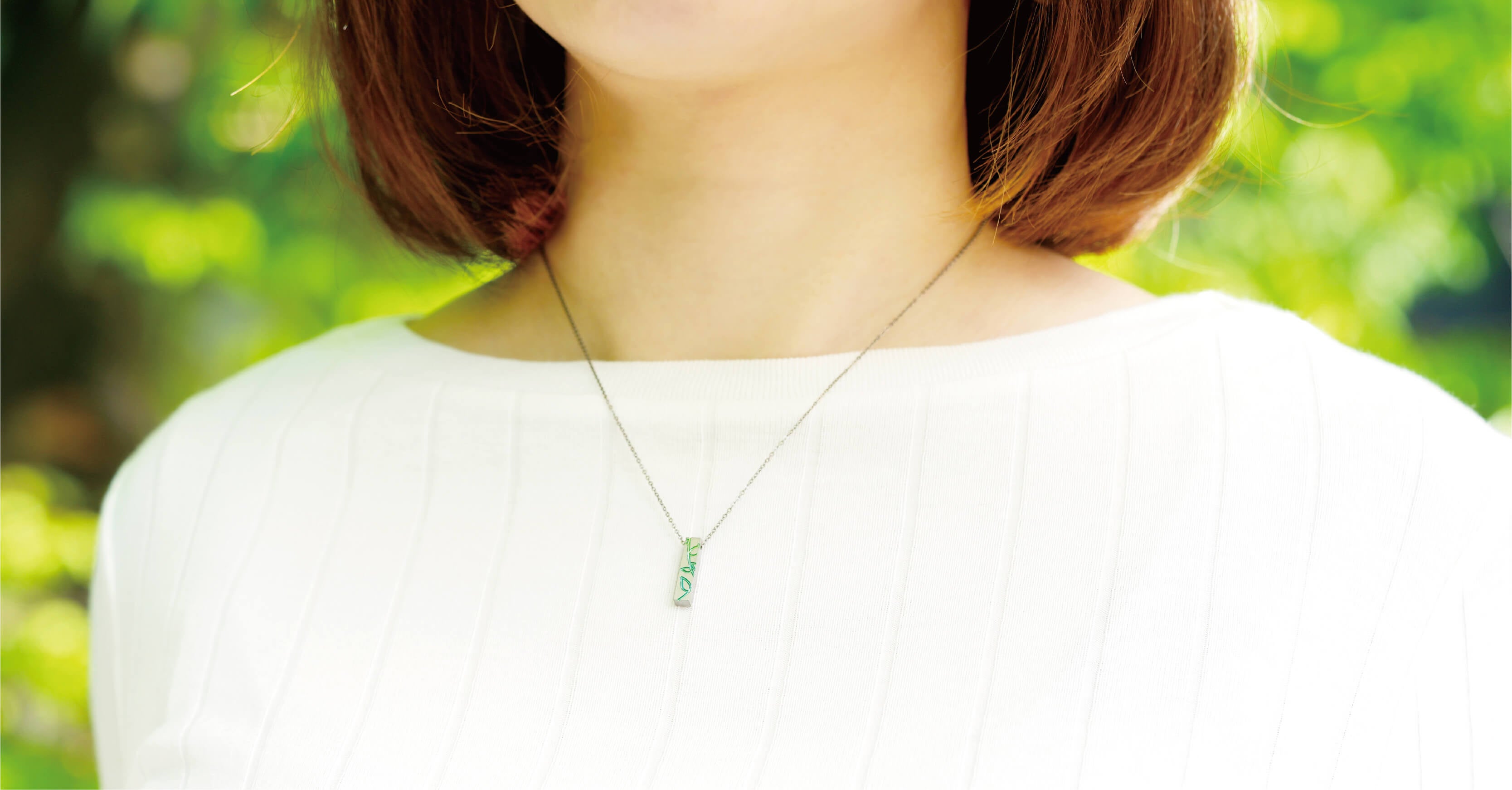 “KOTONOHA”は、感謝のメッセージを数値化し、メッセージの文字数や文字同士の関係性などから、SORA独自のアルゴリズムを使ってケヤキの葉や枝の形をデザインします。このペンダントの素材は、美しい発色が魅力のジルコニウムを使用しており、新緑のケヤキの葉をイメージした4種類のグリーングラデーションカラーから選べます。それぞれのカラーには、異なる感謝の想いが込められています。