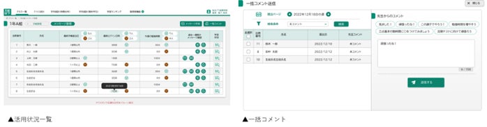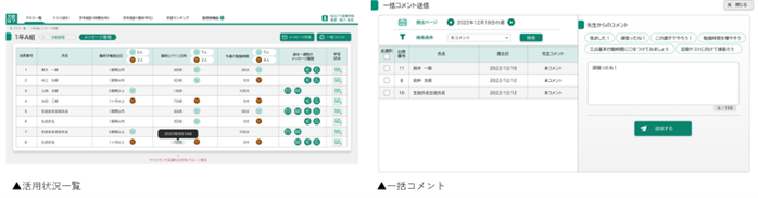 生徒から提出された手帳へのコメント、クラス・学年・教科別の学習時間集計といった従来の機能に加え、複数生徒への一括コメントや活用度に合わせたメッセージ送信ができるようになりました。