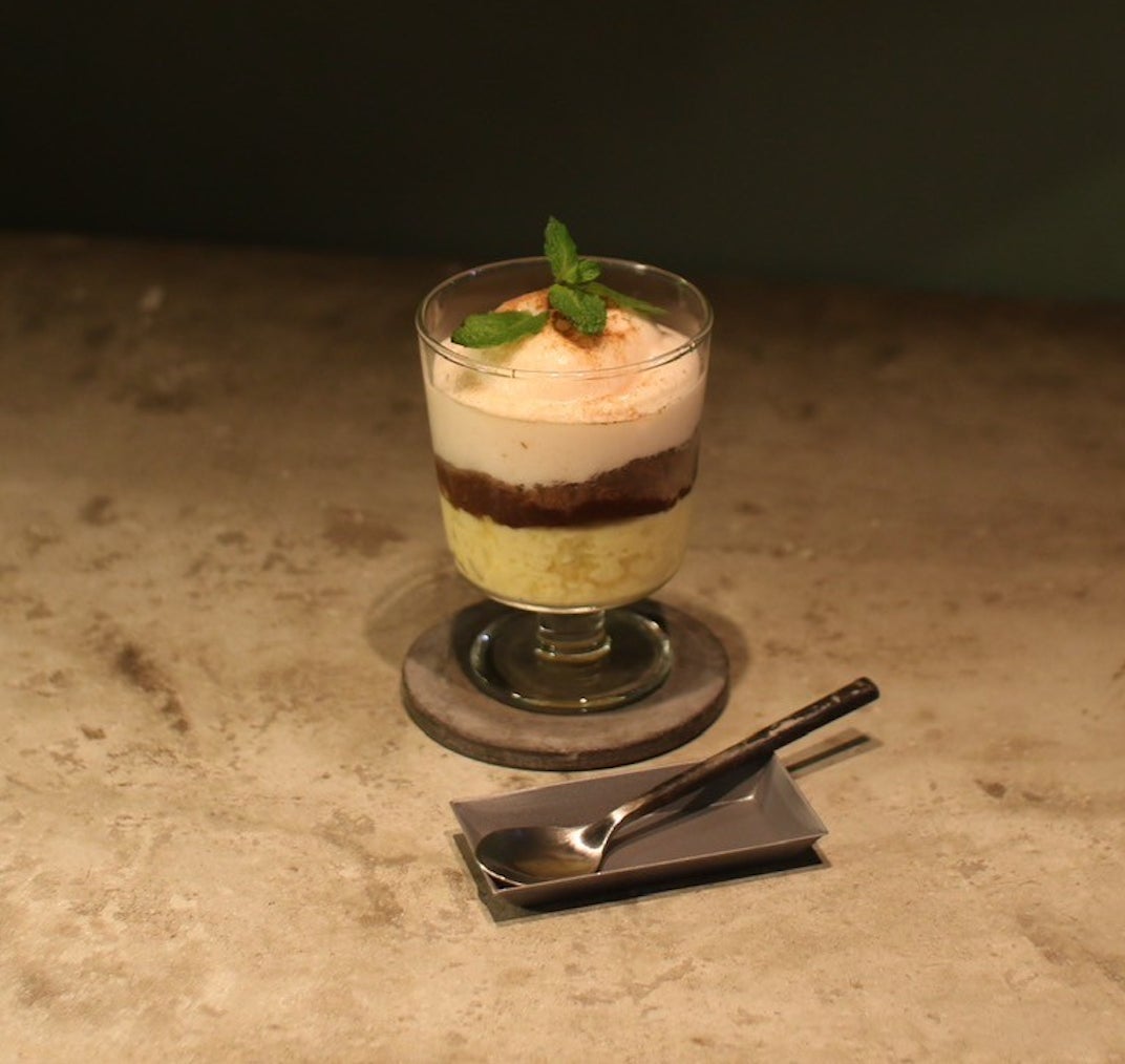 &SPIRITSヘッドバーテンダー中島が考案した「ブラジルのプリンと柚子&カシャッサのエスプーマ」には、ミナスジェライス州で造られる繊細な味わいと澄んだ香りが特徴の「キンタダス カスタネイラス」のジェキチバを使用。練乳を使ったブラジルの伝統的なプリンに、爽やかな柚子のエスプーマを合わせました。