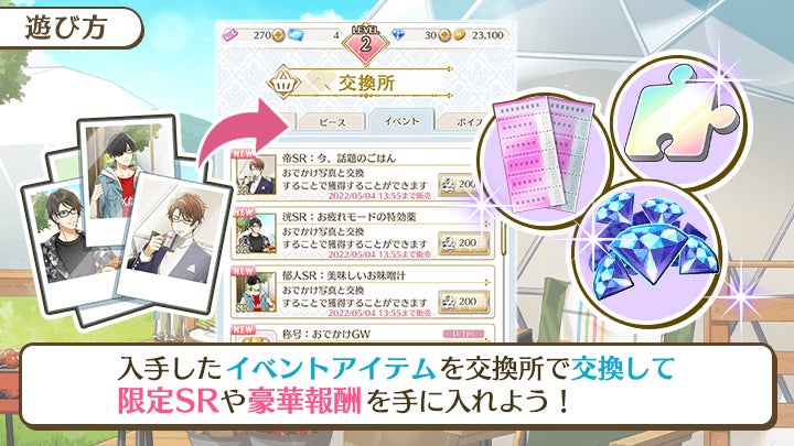 イベントアイテム「おでかけ写真」を手に入れて、イベント限定のSRフォトカードと交換しましょう!