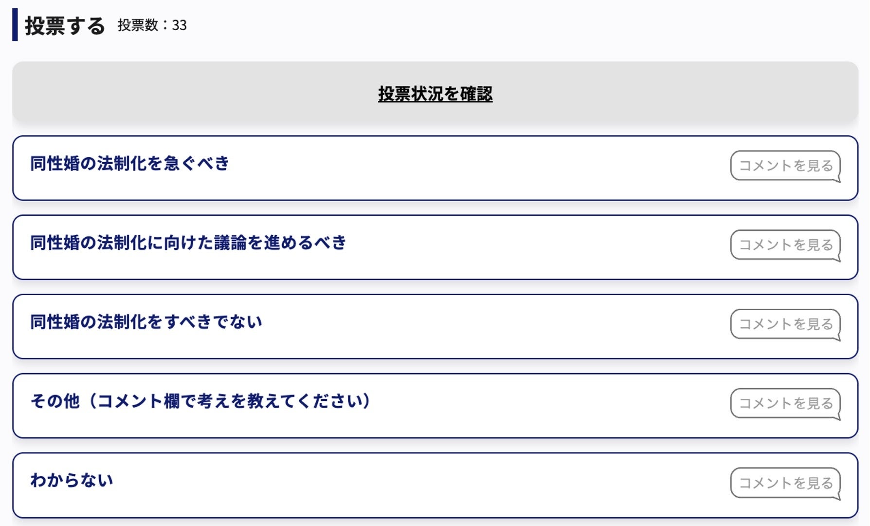 2回目【同性婚の法制化をすべきか?】(2022年2月~4月)https://surfvote.com/issues/21lebhfiy