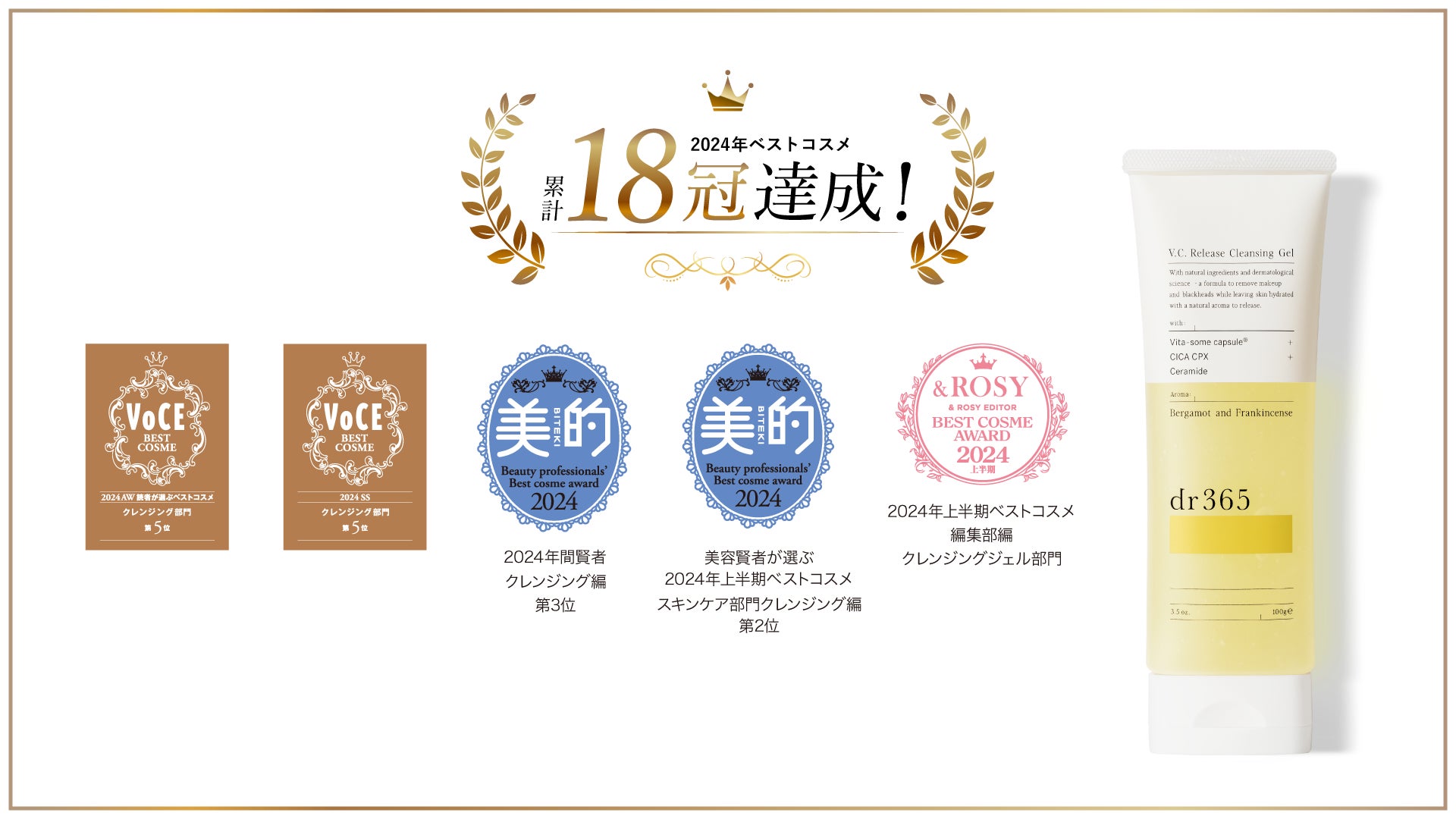 株式会社dr365 (所在地:東京都渋谷区渋谷) の皮膚科学の専門家が監修するスキンケアブランド、dr365(ドクターサンロクゴ)より2024年4月に発売した「V.C. リリースクレンジングジェル」が、『美的 美容賢者が選ぶ2024年年間ベストコスメ クレンジング部門 3位』、『VOCE 2024年下半期読者が選ぶベストコスメ クレンジング部門 5位』など、美容賢者や実際にご使用いただいているユーザーの皆さまから高い評価をいただき、美容・ファッション各誌の2024年度ベストコスメにおいて全18冠*を受賞いたしました。