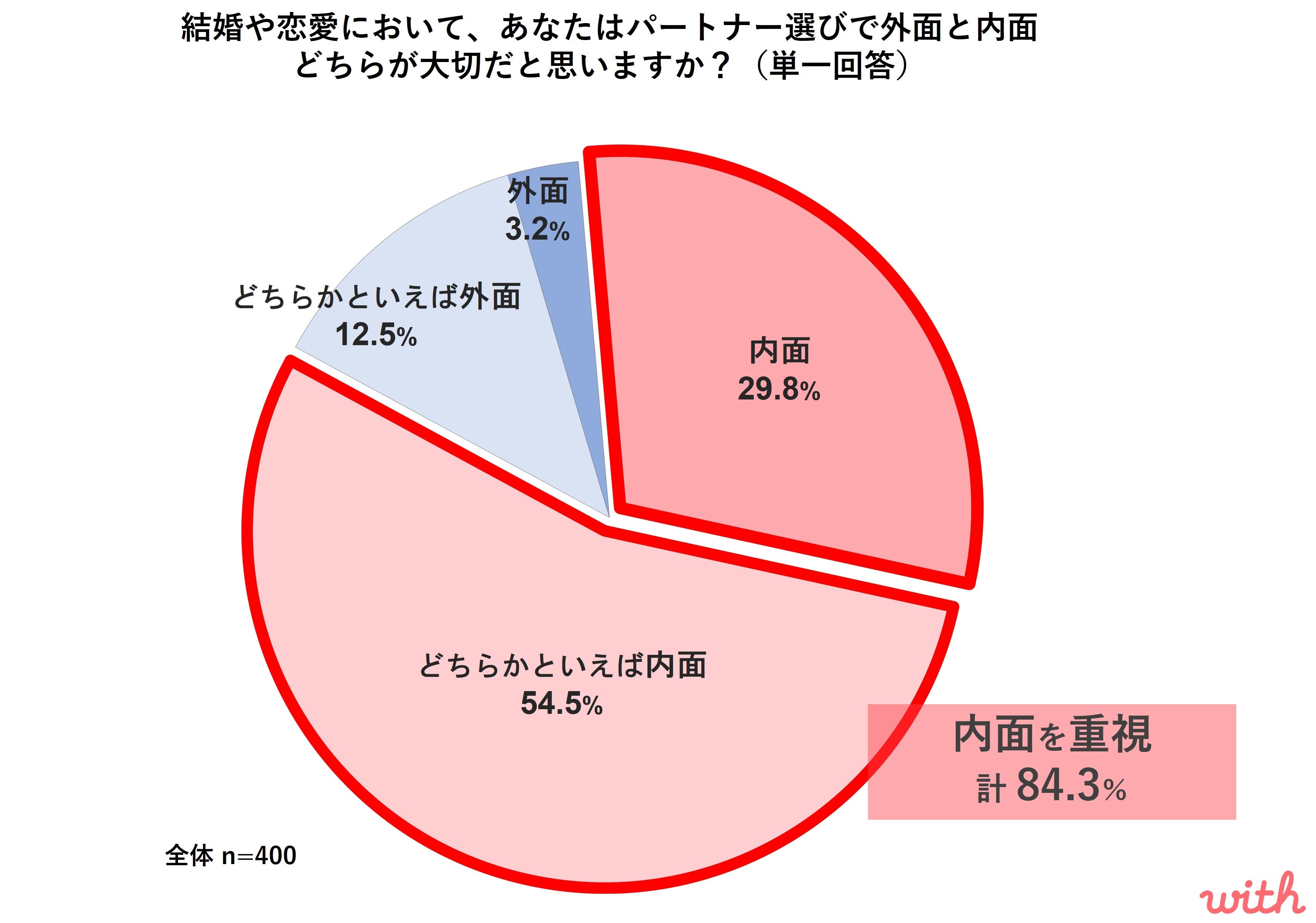 - 20代の84.3%は恋愛において容姿や年収よりも、性格や価値観といった「内面」を重視して恋愛相手を探している