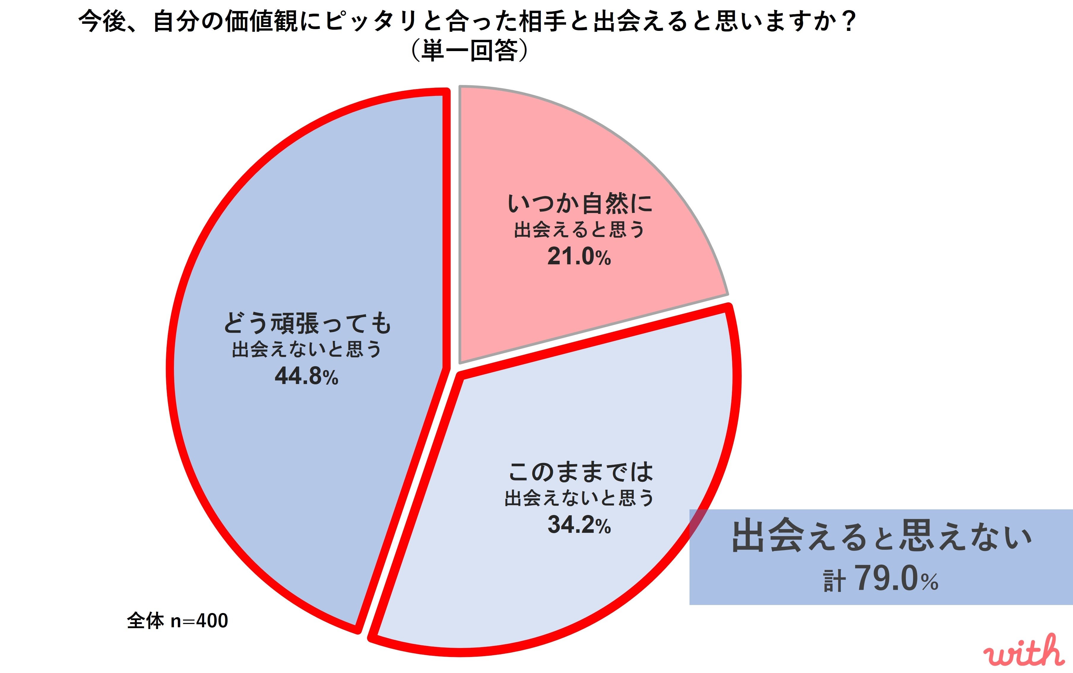 - 今後も理想の相手に出会えないと思っている人は79.0%と、多くの人は価値観での出会いを難しく感じている