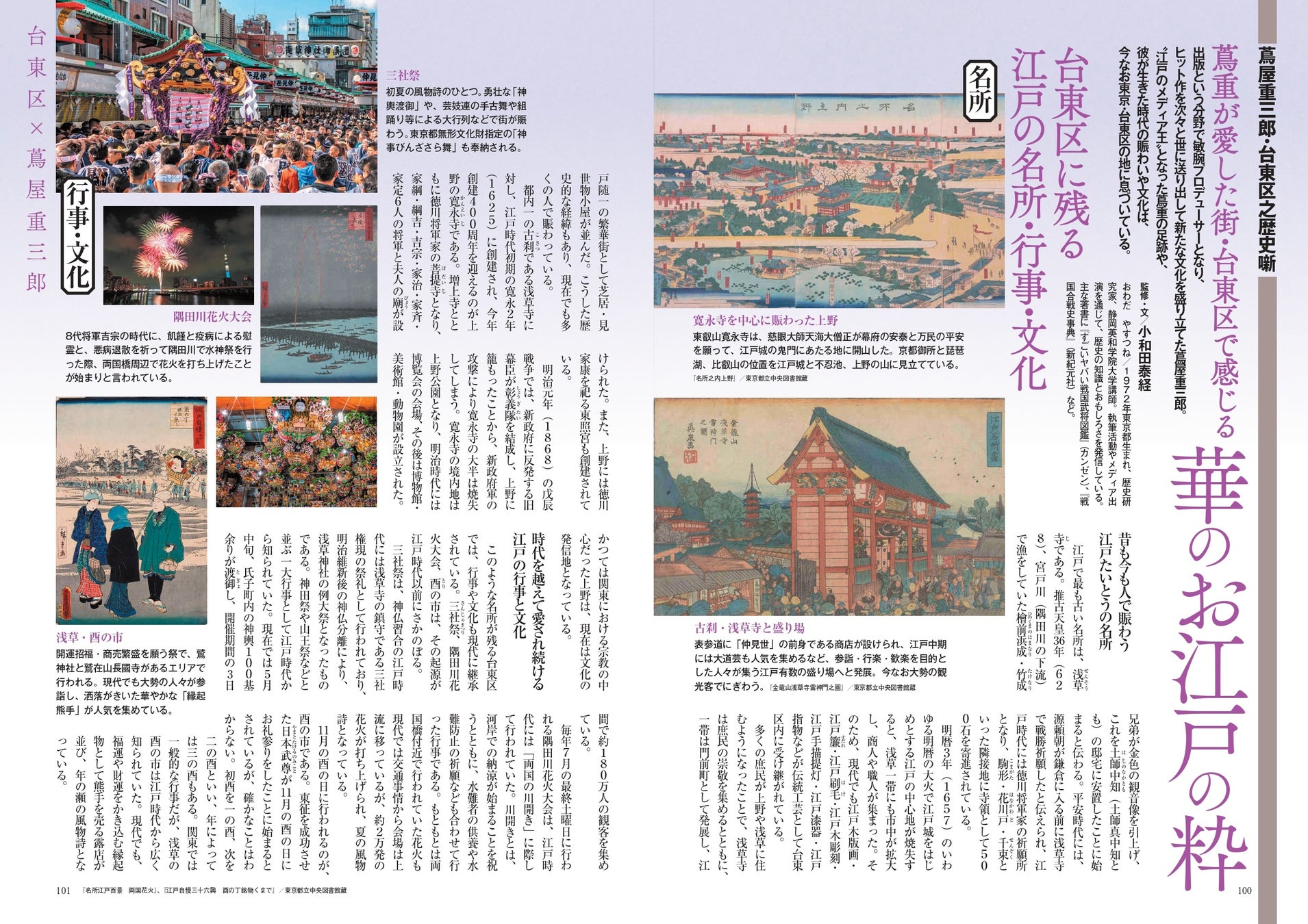 出版という分野で敏腕プロデューサーとなり、ヒット作を次々と世に送り出して新たな文化を盛り立てた蔦屋重三郎。〝江戸のメディア王〟となった蔦重の足跡や、彼が生きた時代の賑わいや文化は、今なお東京・台東区の地に息づいています。今回、人気歴史家・小和田泰経氏が、蔦重ゆかりの地・東京都台東区に残る江戸の名所・行事・文化を詳細に解説。蔦重が江戸文化の中心地であった「吉原」でどのように成功していったのかも紐解きながら、台東区の魅力にスポットライトを当てています。