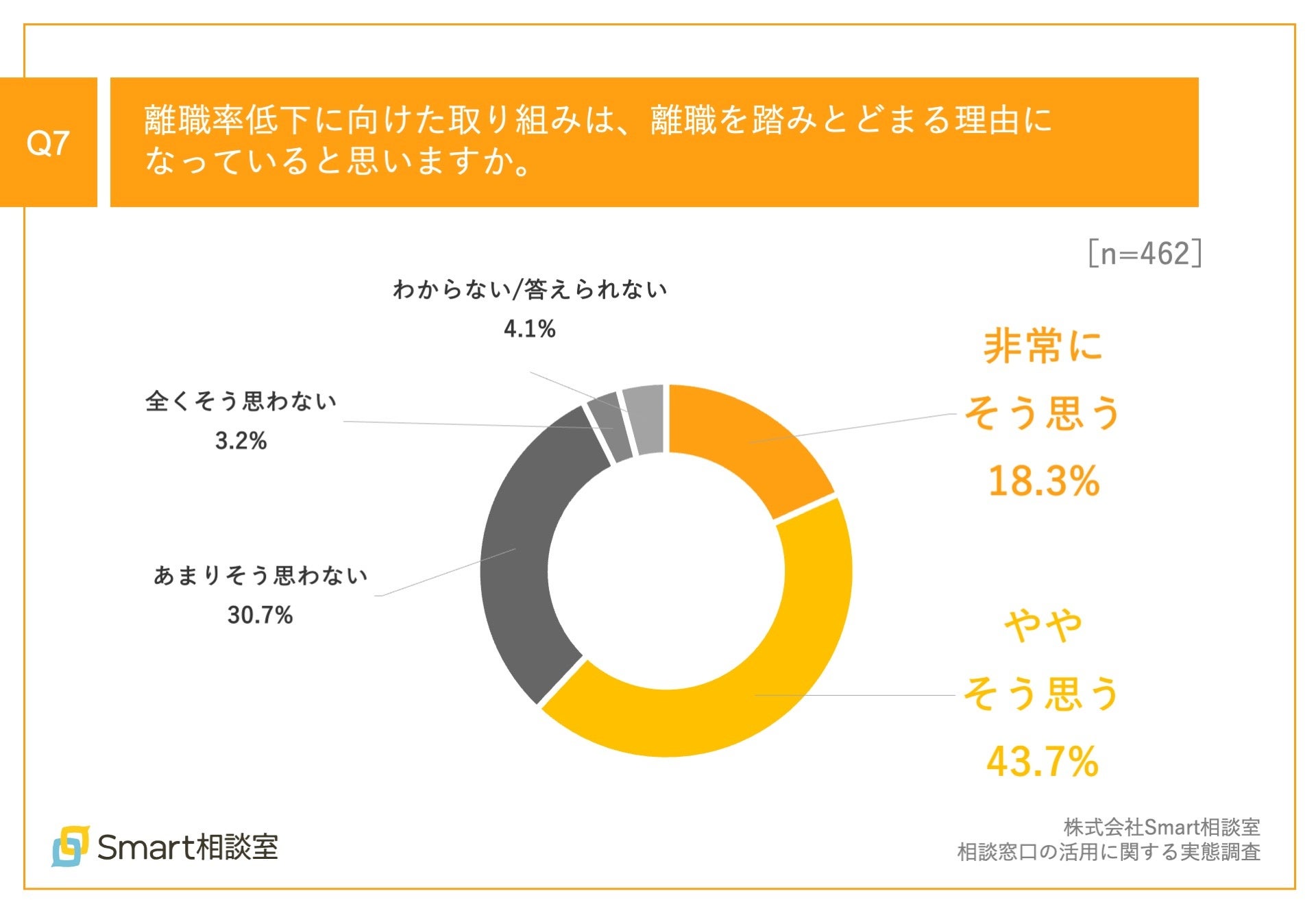 Q1で従業員の離職率低下に向けた取り組みに「注力して取り組んでいる」「やや注力して取り組んでいる」「あまり注力していないが取り組んでいる」と回答した方に、「Q7.それらの取り組みは、離職を踏みとどまる理由になっていると思いますか。」(n=462)と質問したところ、「非常にそう思う」が18.3%、「ややそう思う」が43.7%という回答となりました。