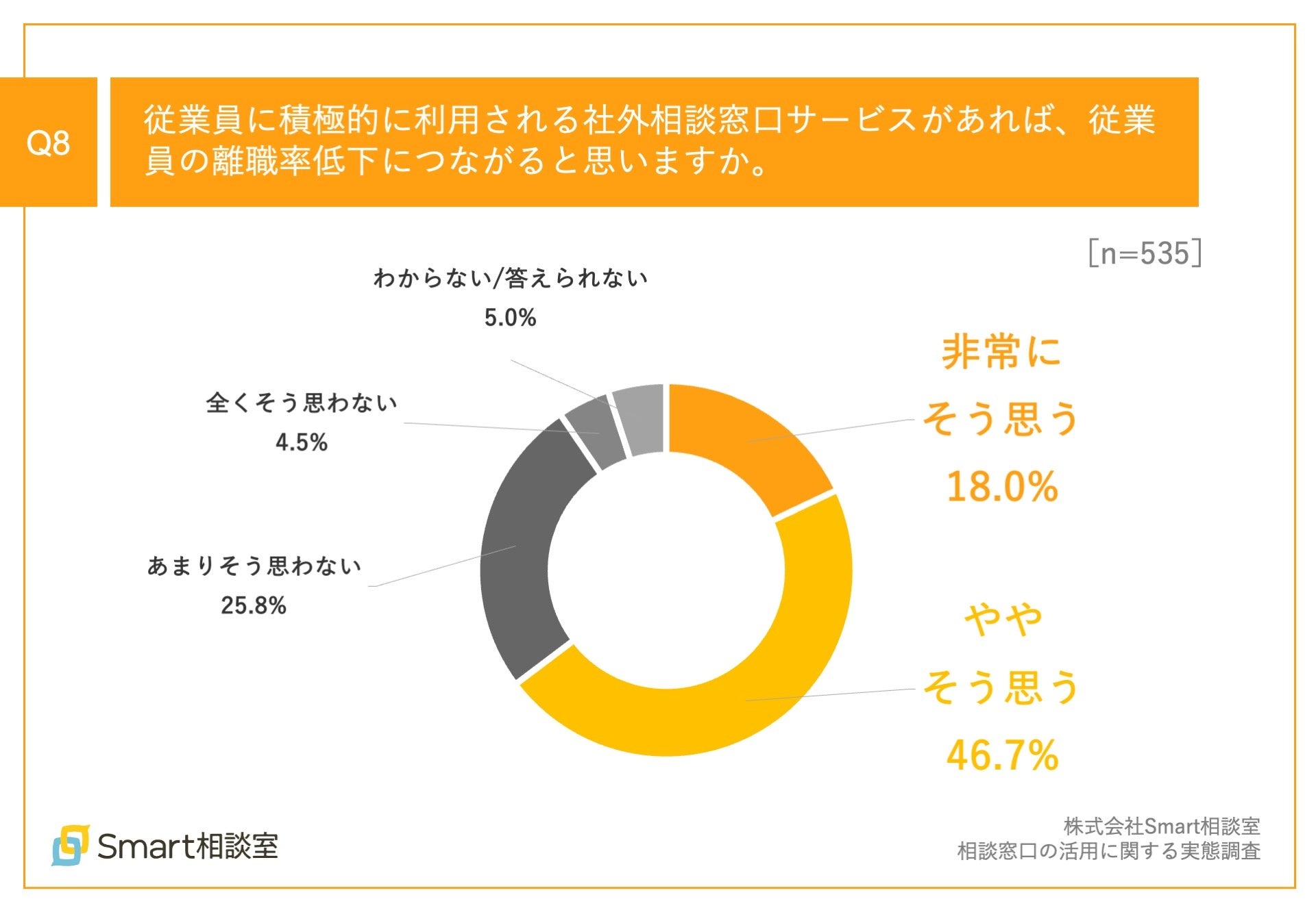 「Q8.従業員に積極的に利用される社外相談窓口サービスがあれば、従業員の離職率低下につながると思いますか。」(n=535)と質問したところ、「非常にそう思う」が18.0%、「ややそう思う」が46.7%という回答となりました。社内に広まるリスクの少ない「社外相談窓口サービス」の活用が、離職率の低下に繋がるという実感を持っている担当者が一定数いることが見受けられます。