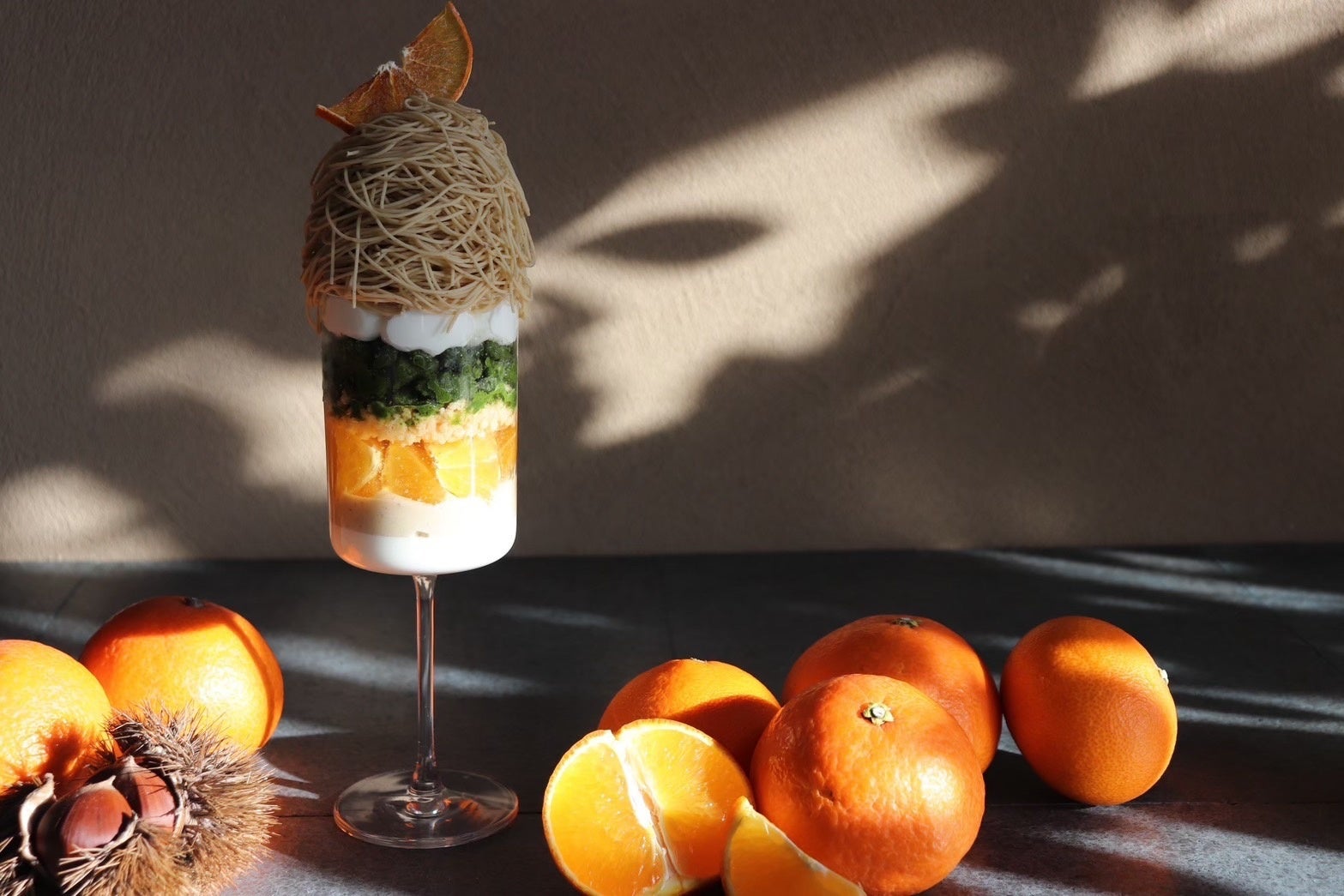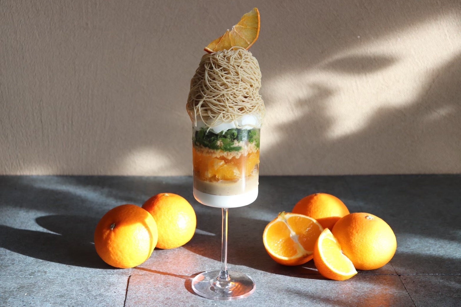 【季節の定番!柑橘を使用したモンブランパフェ】和栗専門紗織より『せとか』を使用した和栗と季節の果物パフェが登場!国産和栗モンブランを目の前で仕上げます。