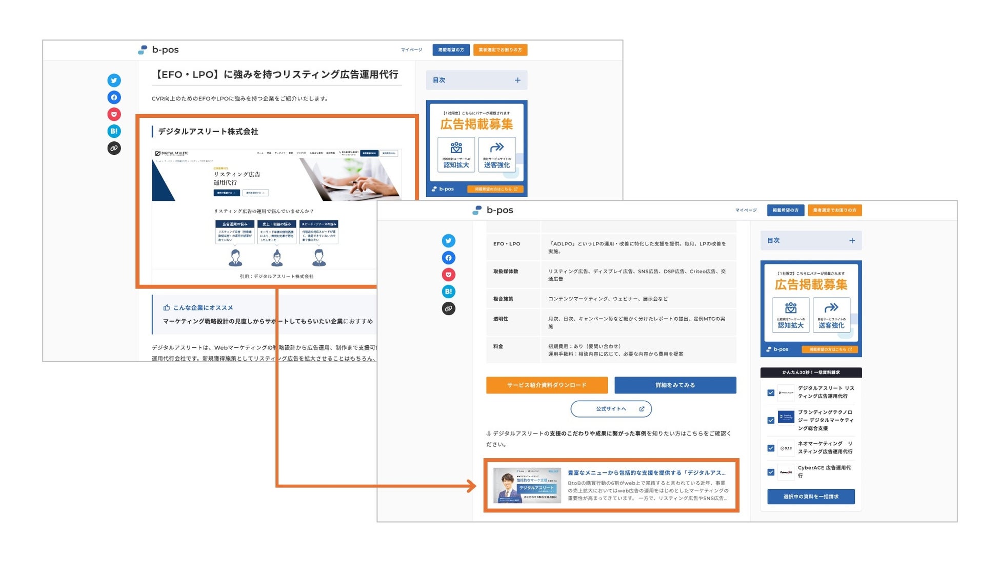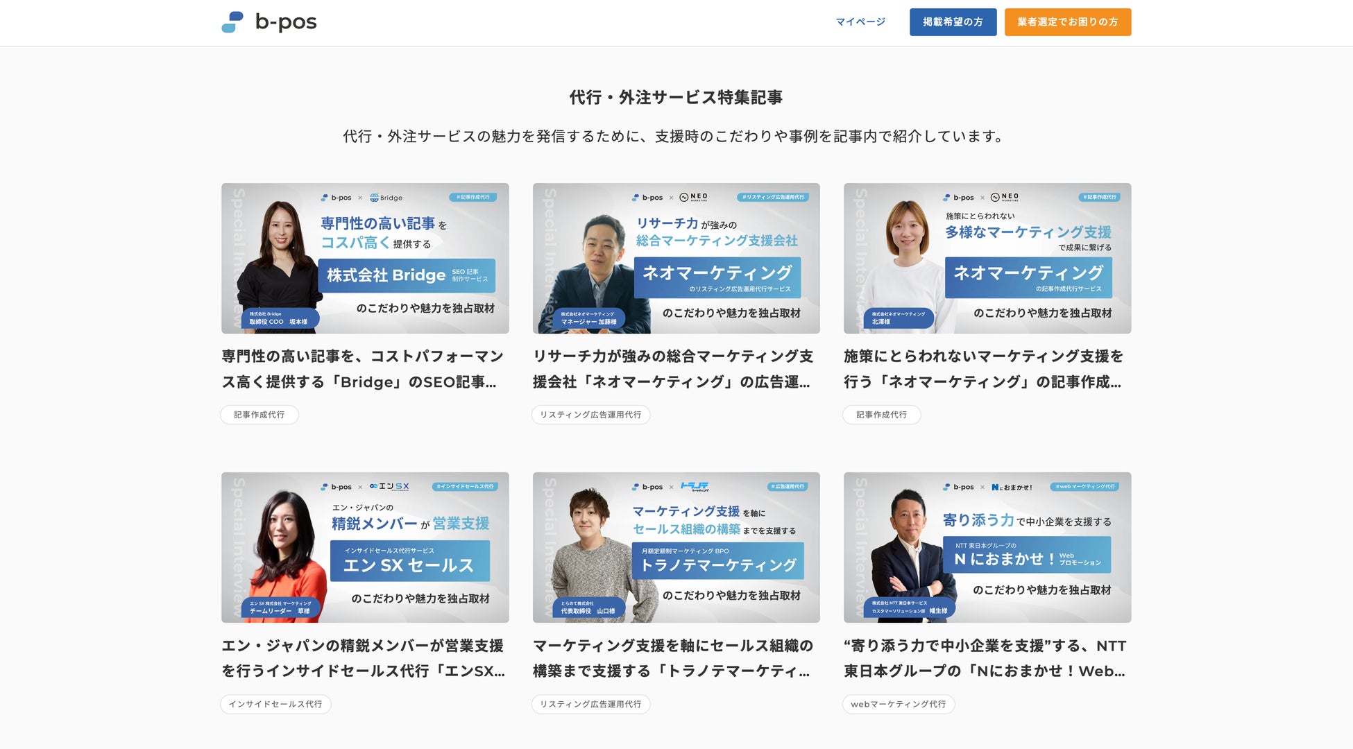 b-posに掲載している各BPO事業者へ単独取材を行い、各サービスの魅力を単独取材記事として発信することで、比較検討層のサービス理解の深化を促し、”ユーザー側の最適なBPOサービスの選択”と”BPO事業者のサイト送客・サービスサイト上でのリード創出”の強化を実現します。