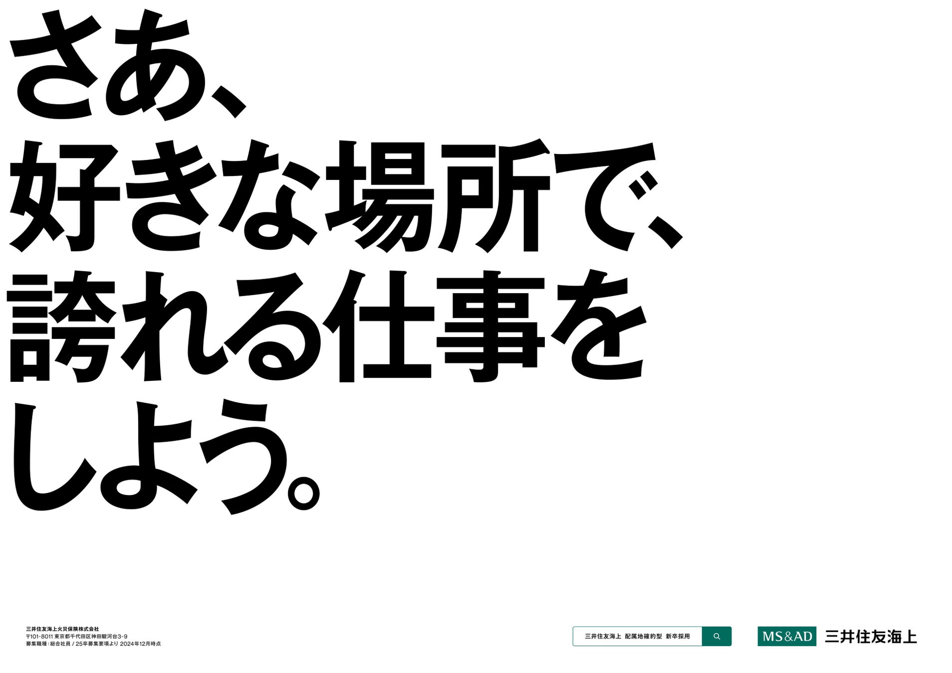 「さあ、好きな場所で、誇れる仕事をしよう。」をコンセプトに、就活生一人ひとりの多様なキャリアやライフスタイルを尊重するプロジェクトです。三井住友海上では、社員一人ひとりが自分らしい生き方を実現できるように人事改革を推進しており、その一環として就活生が自らの意思で働きたい・住みたい場所を決めることができる採用方式「配属地確約コース」を新設しました。地方に多くの部支店を持つ大手金融企業としては先進的な取り組みであり、三井住友海上では創業以来初となります。