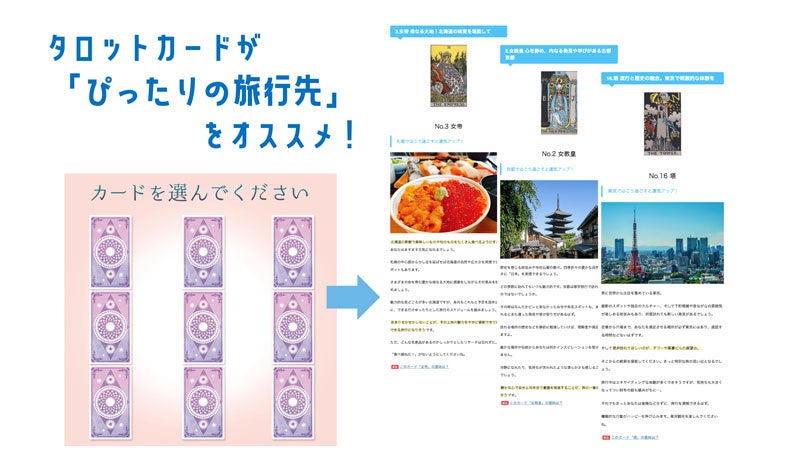 利用者は、今、運勢上もっとも楽しめる最適な国内旅行先をタロットで占うことができます。なぜ今、利用者にとっておすすめの場所なのか、その場所でどう過ごすことが適しているかなどを解説。旅行先を悩む人にとって占いを使った提案を受けることが可能です。