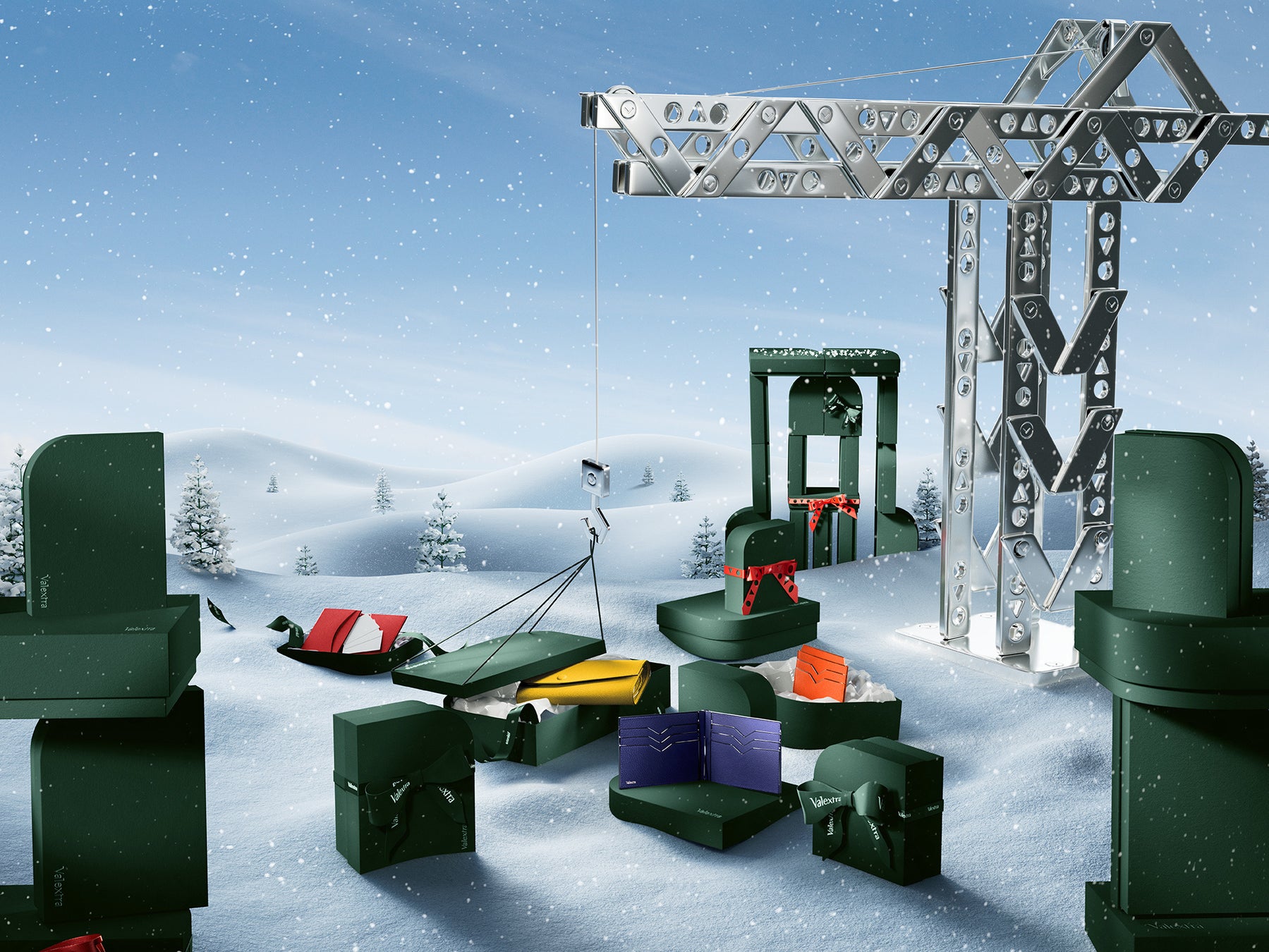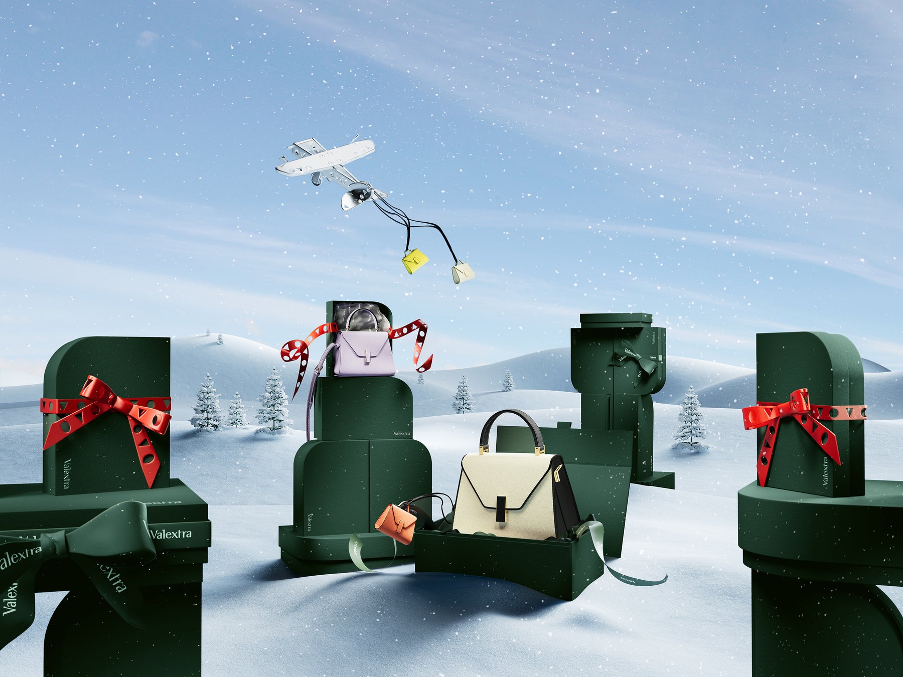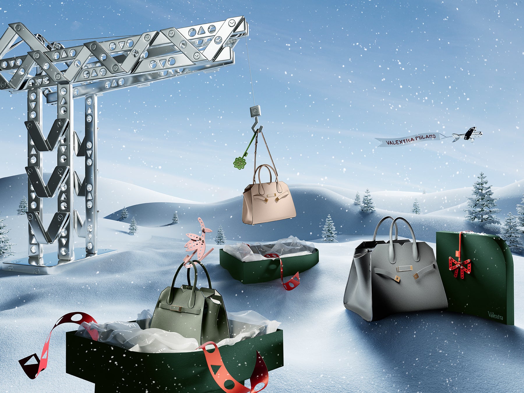 このキャンペーンは、ホリデーシーズンの代名詞ともいえる遊び心あふれるスポットライトの中で、ヴァレクストラのエレガントな機能性を讃えるものです。小さなアクセサリーから日常使いのアイコンバッグや大きなラゲージバッグまで、洗練されたラッピングに包まれたオブジェに心が躍ります。
