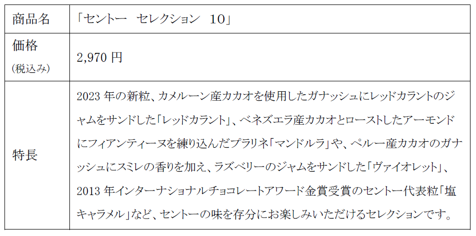 今年のバレンタインは、この時期にしか味わえない「CENTHO」の独自のフィリングにより最大限に引き出されたカカオの風味、ほどけるような口どけを、大切な方への贈り物としてはもちろん、自分へのご褒美としても、ぜひお楽しみください。尚、販売予定の百貨店の催事情報は、公式ブランドサイト(下記)より、ご確認いただけます。
