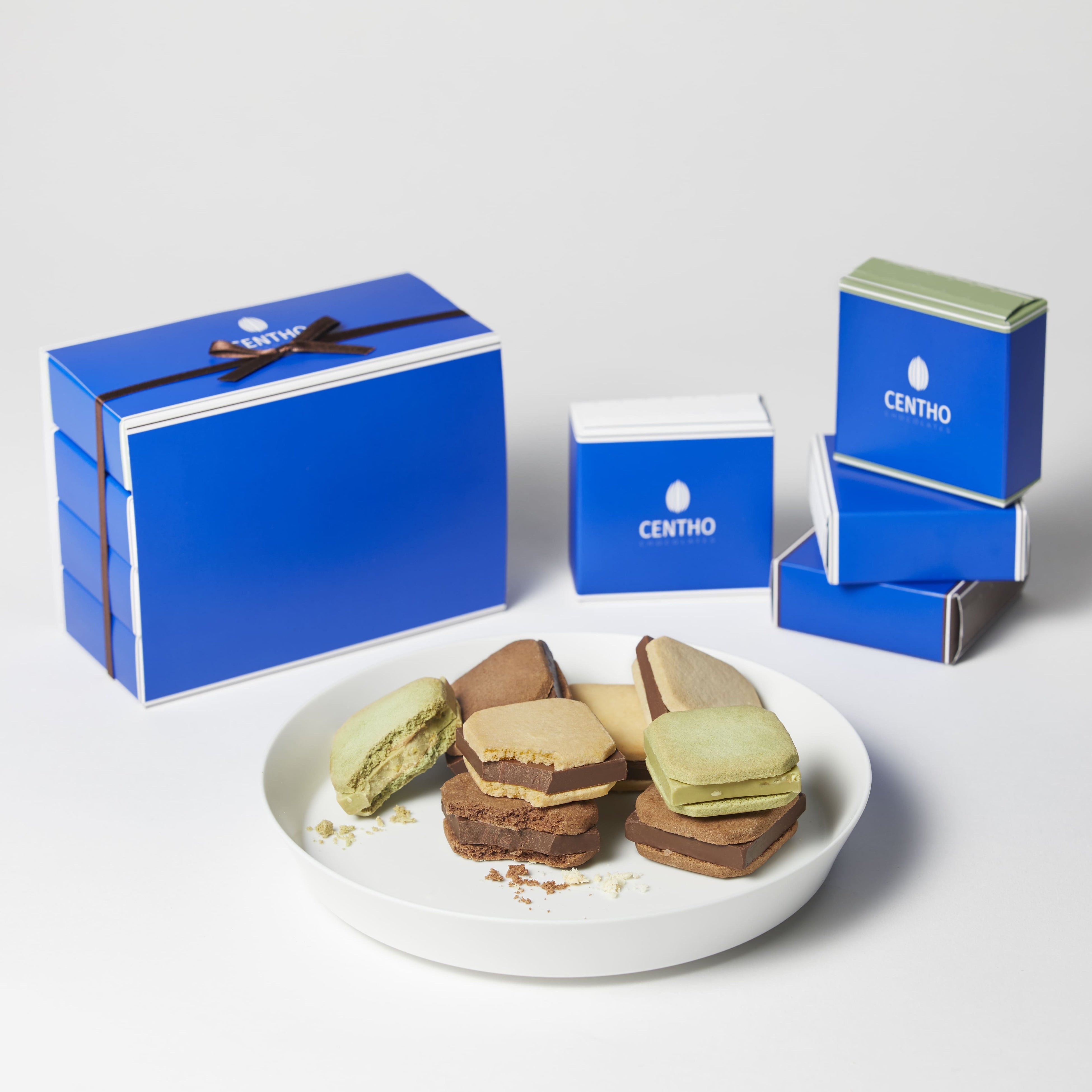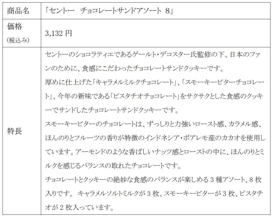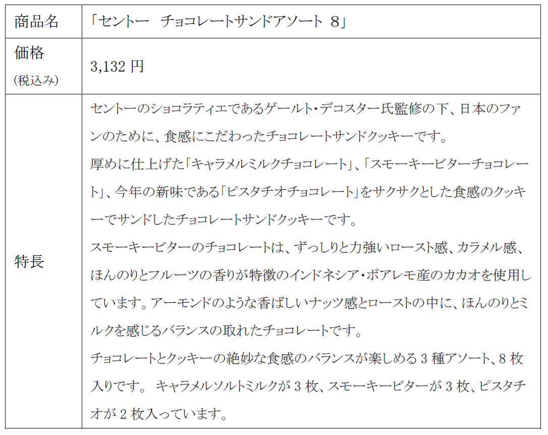 また、これらCENTHO定番のチョコレートのほか、国内限定販売の「チョコレートサンドクッキー」には、今年の新味であるピスタチオを含めた3種があり、1個入りだけでなく全種類が楽しめるアソートボックスもご用意しています。中でも特にこだわったスモーキービターは、アーモンドのような香ばしいナッツ感とローストの中に、ほんのりとミルクを感じるバランスの取れたチョコレートです。