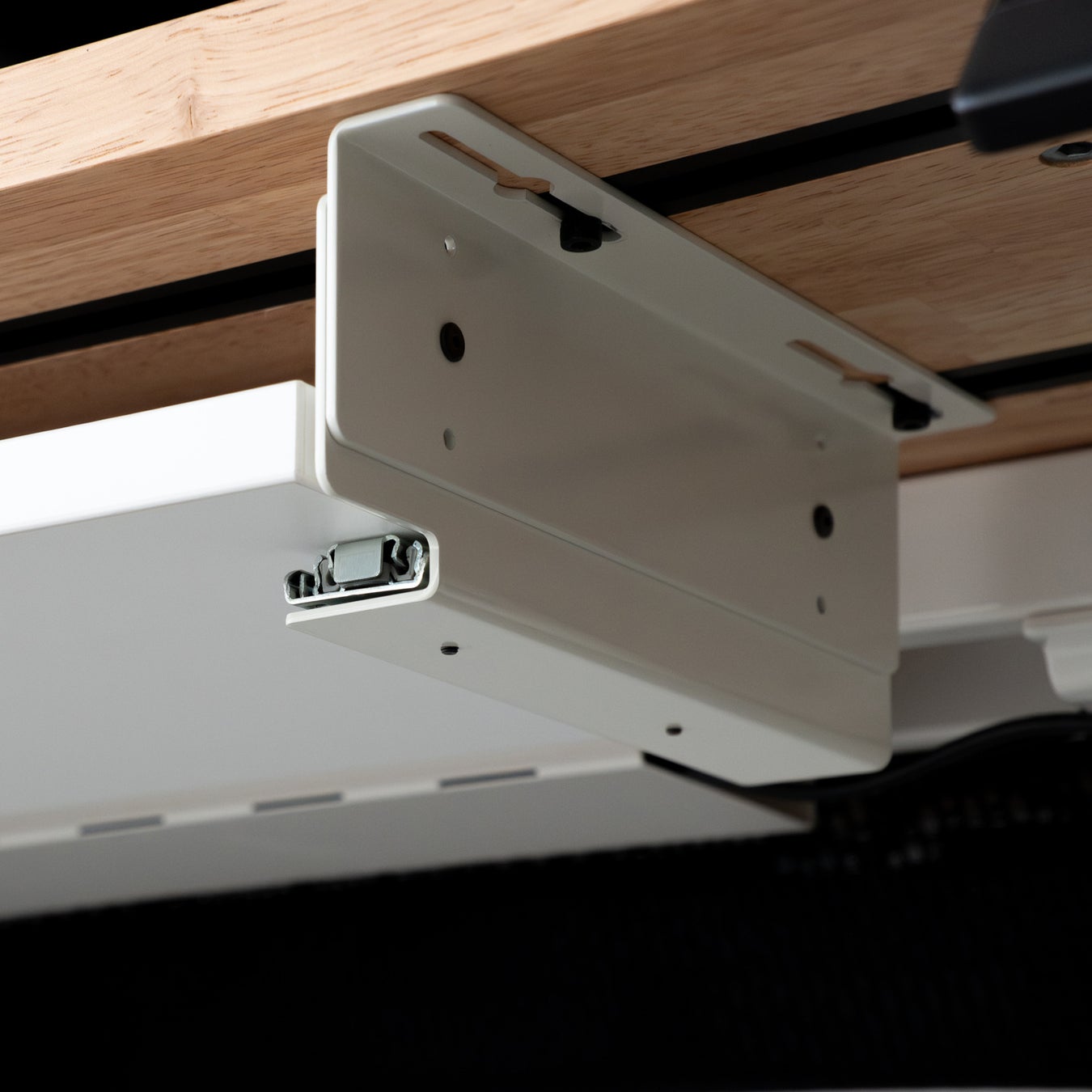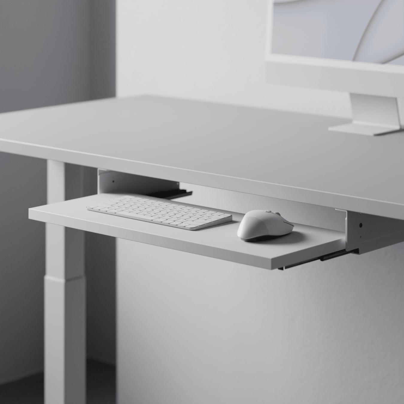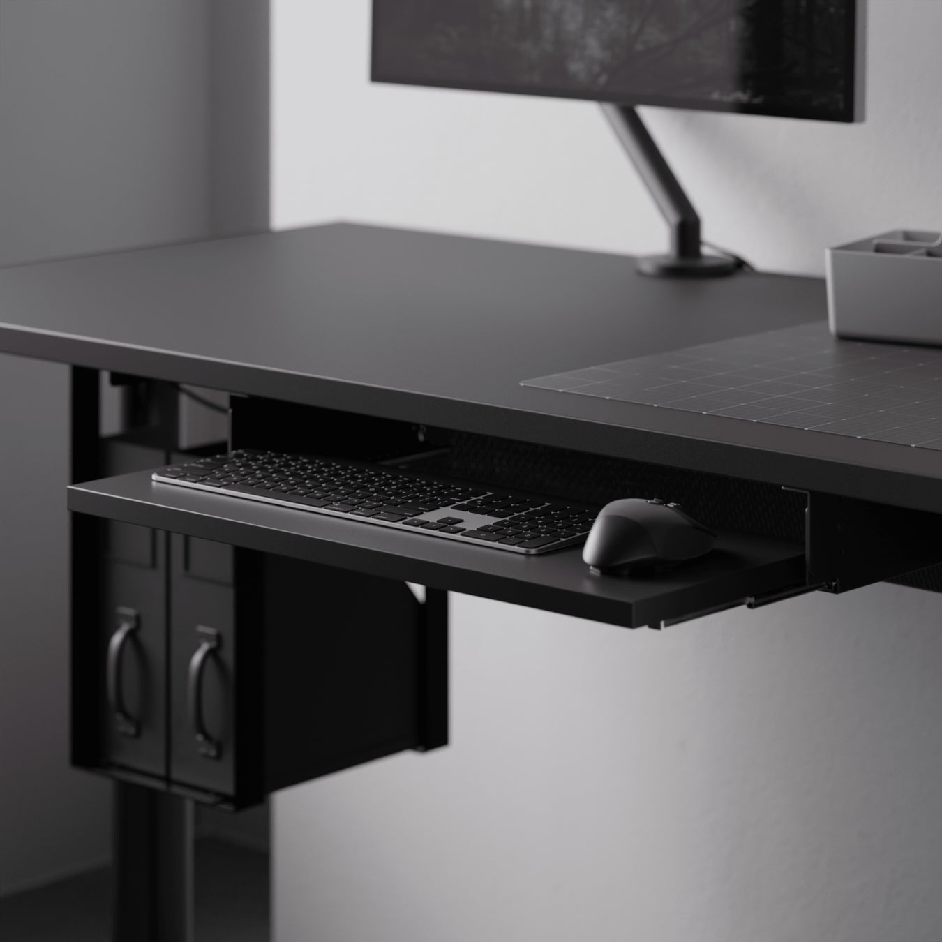 その名の通り「キーボード」を載せるのはもちろん、タブレットやカラーパレット、音楽機材など多種多様な入力機器やデバイスをデスクのすぐ下に格納し、レールで簡単に取り出せるようにするモジュールです。