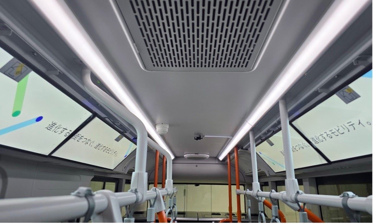 本導入では、自動運転バス車内に横長のデジタルサイネージモニタを5台設置し、以下の用途で活用されます。