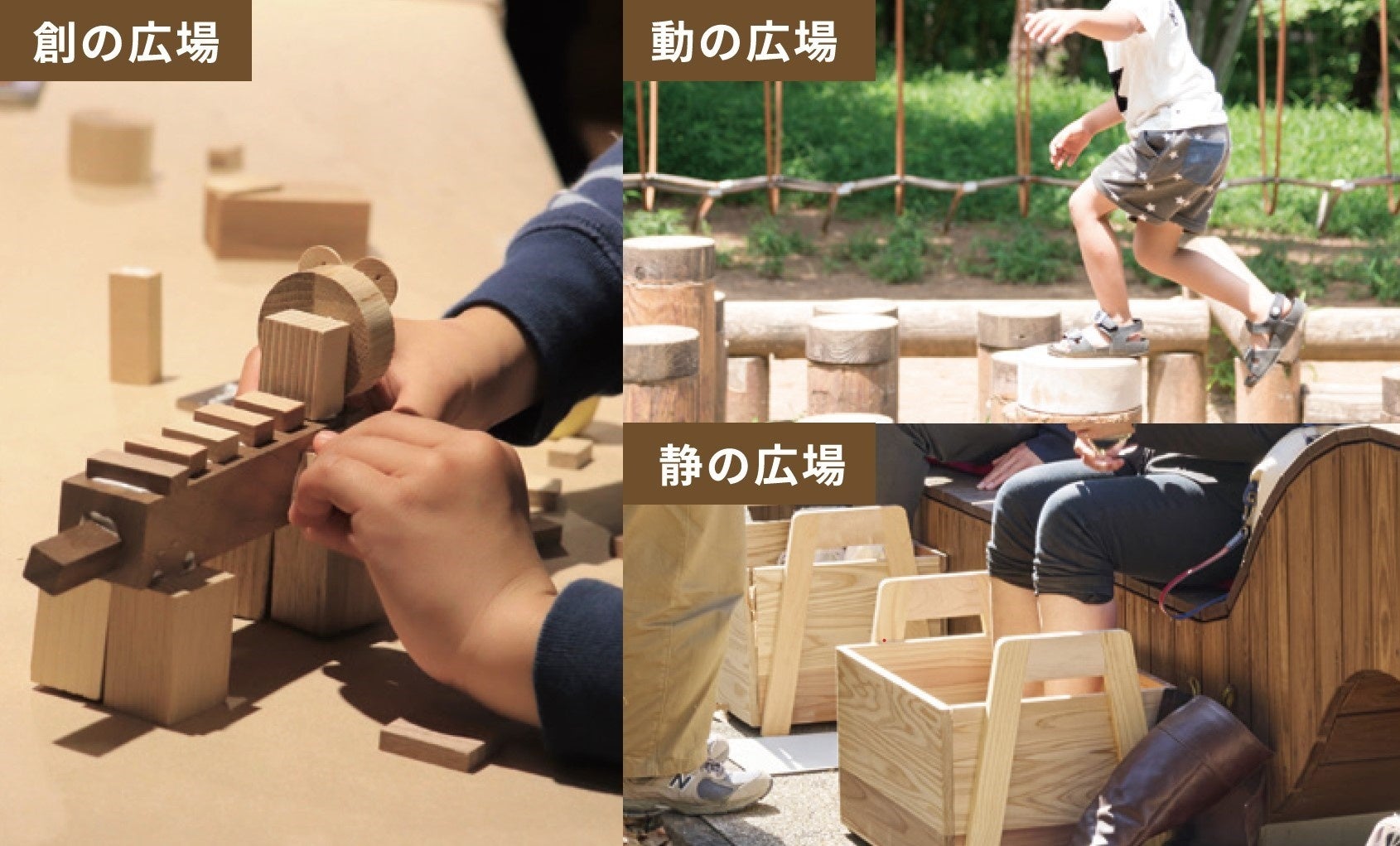 動の広場:木製遊具や健康器具で、木の温もりやクッション性を感じながら身体を動かす。