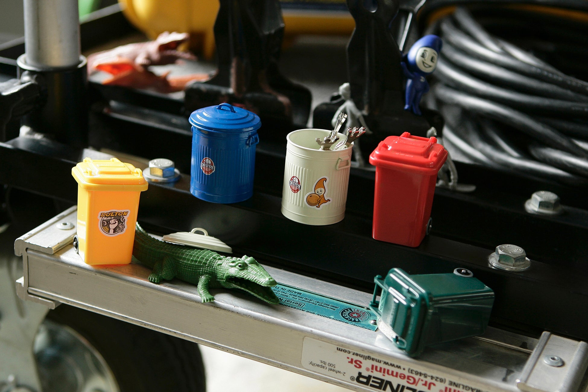 動きのあるハンドルや取り外し可能な蓋、お馴染みのステッカーなどを再現したガベージカン、蓋の開閉やキャスターの回転、エンボス仕上げのロゴなどを再現したプラスチックトラッシュカン。
