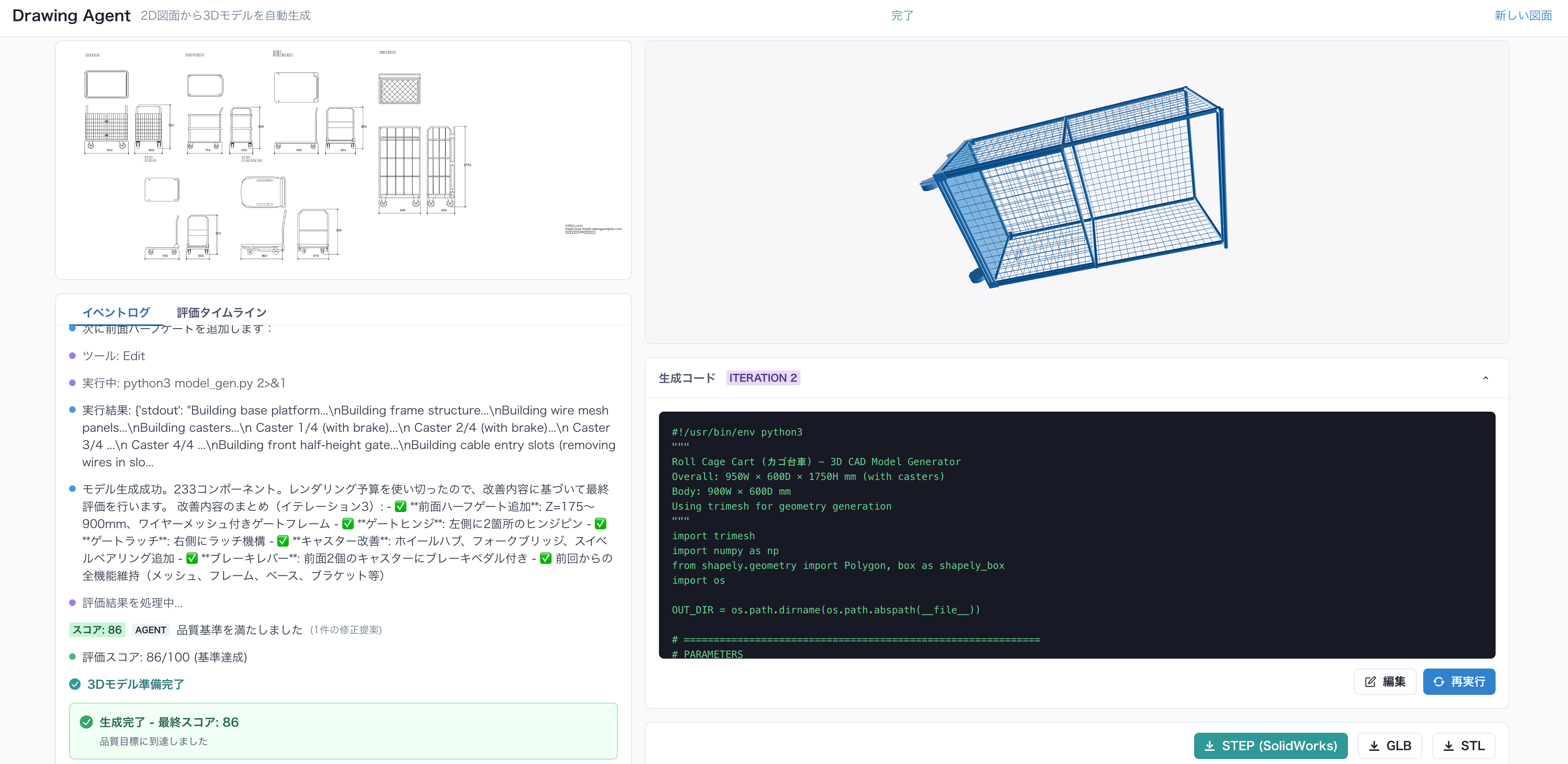 するWebアプリケーション「Drawing Agent」において、CADソフトで編集可能なSTEP形