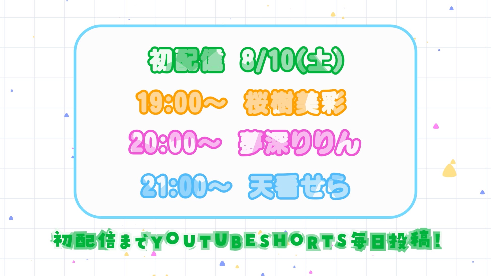 初配信は8月10日(土)19時。V-TIPSとYouTubeの各ライバーのチャンネルにて同時配信で、リレー形式で行います。桜樹美彩、夢深りりん、天看せらの初配信をぜひお楽しみください。