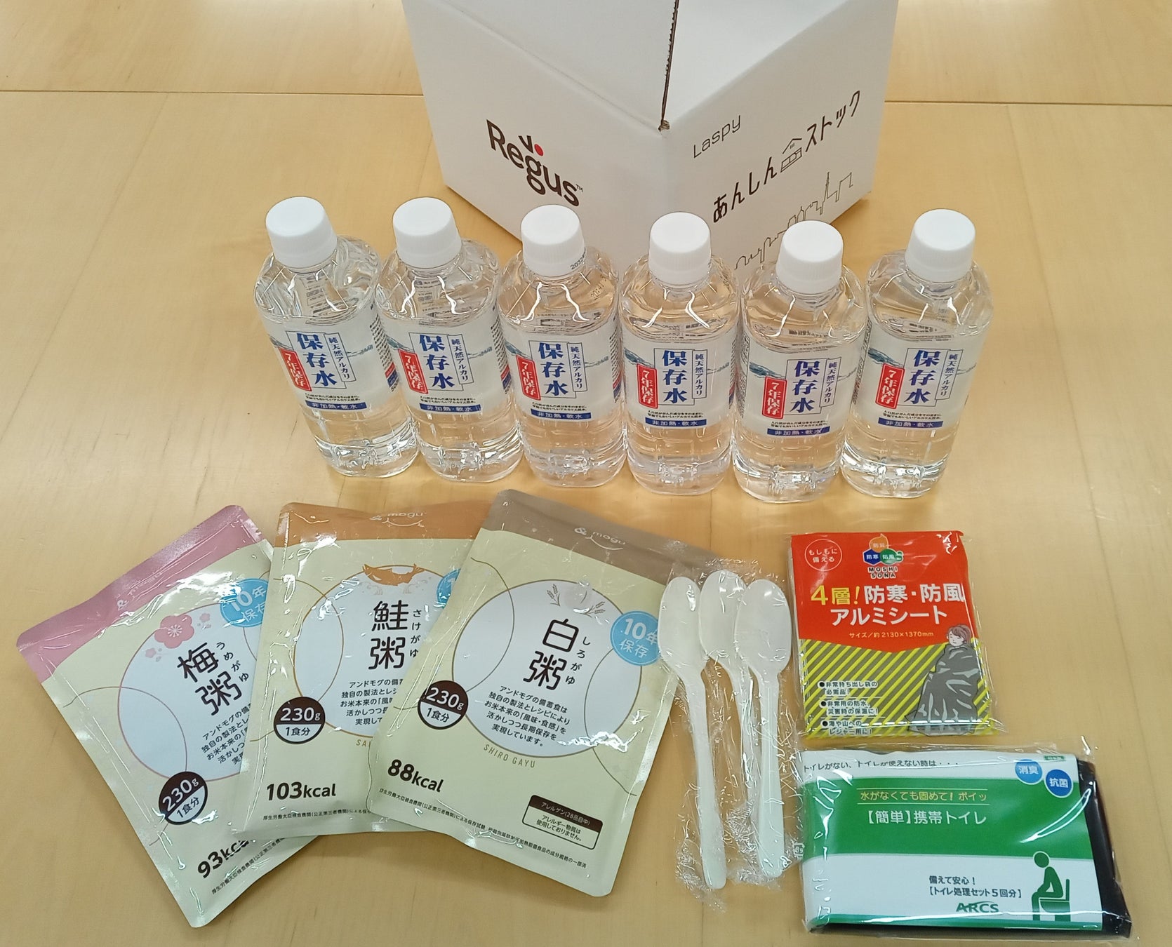 備蓄品は、保存食、保存水、非常用トイレ、アルミブランケットをパッケージした内容になっています。尚、賞味期限の近づいた備蓄品については、フードバンク等のNPOへの寄付を行います。