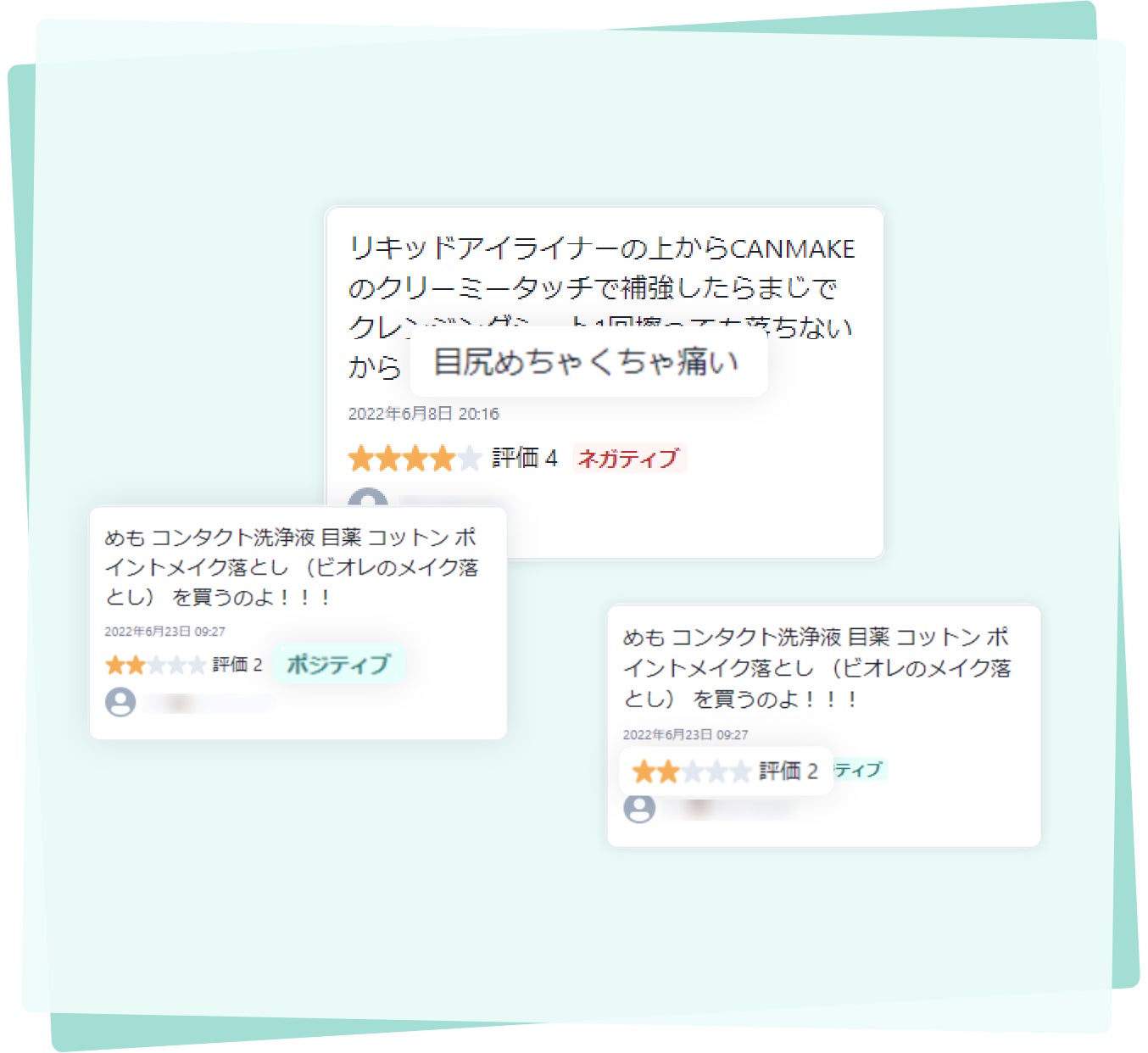 SNS・レビューの膨大なデータに隠れた消費者の声をTDSE独自のAIが抽出・分類・分析・評価を行い、効果的な商品開発や施策立案、サービス改善が実現できます。